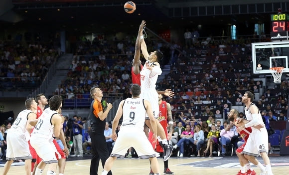 Ημίχρονο στο Barclaycard Center, η Ρεάλ προηγείται με 35-28. Ματσιούλις με 9 για τους Μαδριλένους και Λοτζέσκι με 10 (όλους στο 1ο δεκάλεπτο) για τους Πειραιώτες, οι πρώτοι σκόρερ του τελικού.