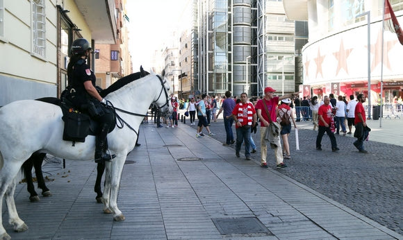 Η έφιππη αστυνομία της Μαδρίτης σε επιφυλακή έξω από το γήπεδο, την στιγμή που φίλοι του Ολυμπιακού εισέρχονται σιγά σιγά στο Barclaycard Center.