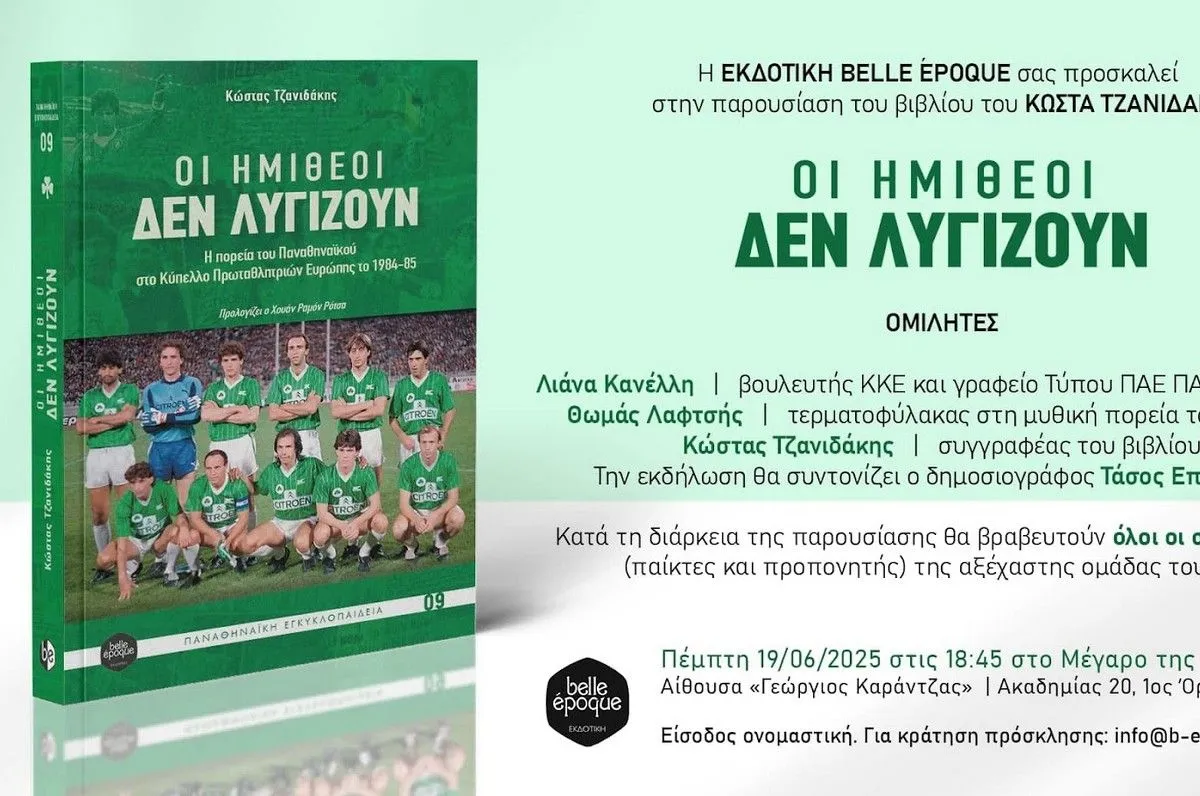 Η Εκδοτική Belle Époque σας προσκαλεί σε μια καταπράσινη βραδιά, με εκλεκτούς καλεσμένους τους Ημίθεους του Παναθηναϊκού. Ο Κώστας Τζανιδάκης και οι πρωταγωνιστές της θρυλικής ομάδας της περιόδου 1984-85 θα μας ταξιδέψουν σε γνωστές και άγνωστες στιγμές της πορείας του Τριφυλλιού ως τους 4 του Κυπέλλου Πρωταθλητριών Ευρώπης.