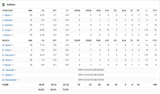 Για τους Σέλτικς, ο Καϊρί Ίρβινγκ είχε 22 πόντους, ο Μάρκους Μόρις 21 πόντους και οι Αλ Χόρφορντ και Γκόρντον Χέιγουορντ από 19 πόντους.