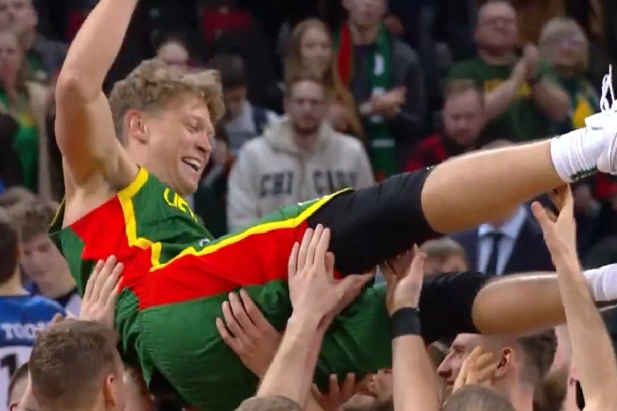 Οι παίκτες της Λιθουανίας σήκωσαν στα χέρια τον Μιντάουγκας Κουζμίνσκας, ο οποίος αγωνίστηκε για τελευταία φορά με την εθνική ομάδα της χώρας του.