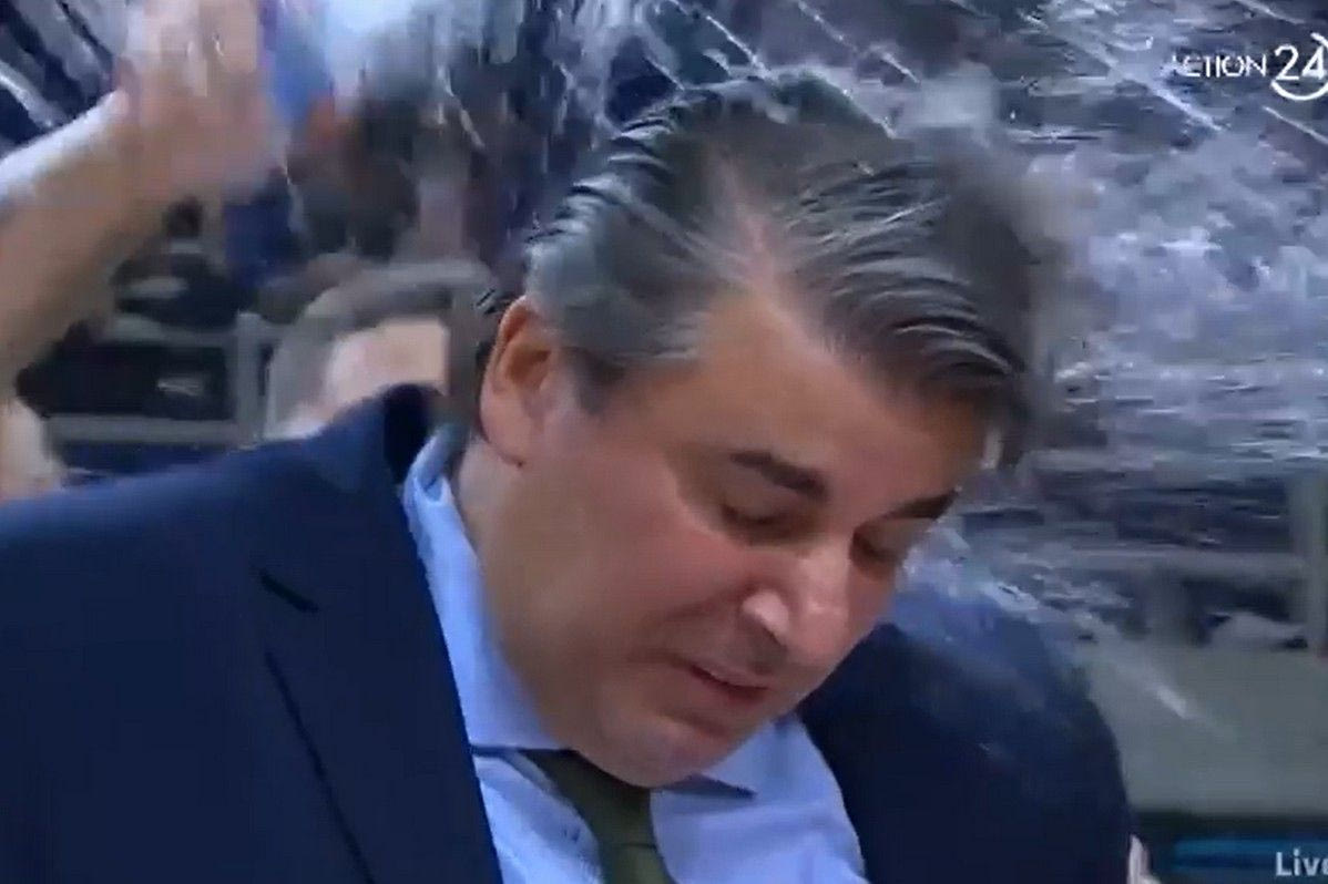 Μάλιστα, ένα γκρουπ παικτών επιφύλασσε μια αναπάντεχη στιγμή “δροσιάς” στον προπονητή της ομάδας, τον Μιχάλη Κουρή, διακόπτοντας τη flash interview και τον μπουγελώνοντας τον έμπειρο τεχνικό.