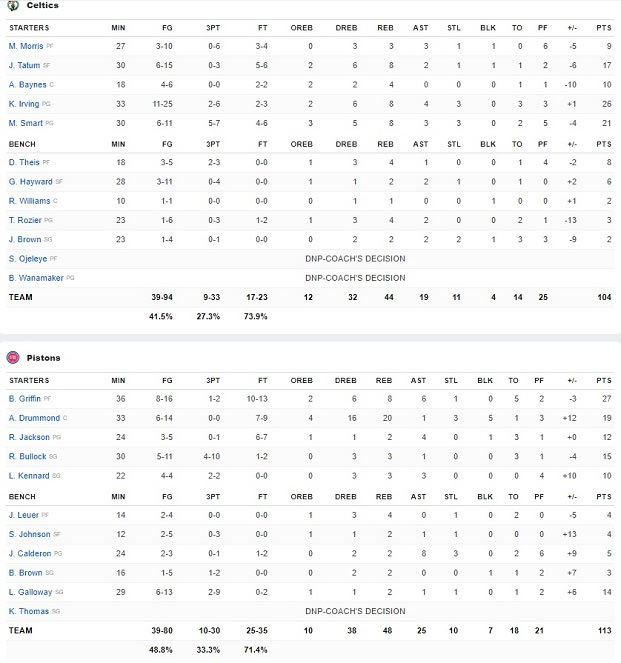 Ο Καϊρί Ίρβινγκ (26 πόντοι, 8 ριμπάουντ, 3 κλεψίματα), ο Μάρκους Σμαρτ (21 πόντοι, 8 ριμπάουντ, 3 κλεψίματα) και ο Τζέισον Τέιταμ (17 πόντοι, 8 ριμπάουντ) ήταν οι πρώτοι σκόρερς της Βοστώνης, η οποία προηγήθηκε με 66-63 στο 27’ αλλά δέχτηκε ένα σερί 0-13 στα επόμενα τρία λεπτά και δεν συνήλθε ποτέ από αυτό. Οι “κέλτες” πλησίασαν μέχρι τους επτά πόντους στο 44′, αλλά οι Πίστονς ήταν σε πολύ καλή βραδιά επιθετικά για να χάσουν αυτό το παιχνίδι.