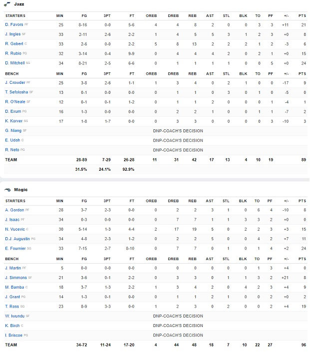 Ο Εβάν Φουρνιέ πέτυχε 24 πόντους και ο Τέρενς Ρος έβαλε 10 από τους 19 στην τέταρτη περίοδο για το Ορλάντο, ενώ ο Νίκολα Βούτσεβιτς είχε 15 πόντους, 19 ριμπάουντ και 5 ασίστ. Ούτε τα 15 λάθη που έκανε το Ορλάντο στο πρώτο ημίχρονο (!) μπόρεσε να εκμεταλλευτεί η Γιούτα, η οποία προηγήθηκε με 10-2 στο 6’ και με 46-35 στο 27’, αλλά δέχτηκε 61 πόντους στα επόμενα 21 λεπτά και τελείωσε το ματς με ποσοστό 31,5% στα σουτ. Ο Ντέρικ Φέιβορς (21 πόντοι, 8 ριμπάουντ) και ο Ντόνοβαν Μίτσελ (24 πόντοι) ήταν αυτοί που ξεχώρισαν από την ομάδα του Κουίν Σνάιντερ, η οποία υπέστη την 3η ήττα στα τελευταία 4 ματς.