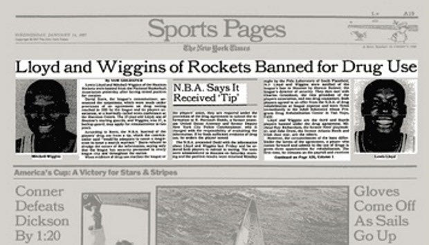 ” Ο Λούις Λόιντ κι ο Μίτσελ Γουίγκινς των Χιούστον Ρόκετς τιμωρήθηκαν από το ΝΒΑ με τον Κομισάριο Ντέιβιντ Στερν να ανακοινώνει ότι οι δύο αθλητές θα έχουν το δικαίωμα να αιτηθούν την επανένταξή τους σε δύο χρόνια. Ο Στερν αρνήθηκε να μοιραστεί τις λεπτομέρειες της υπόθεσης, είπε ωστόσο ότι η Λίγκα έχει προσωπικό σε κάθε πόλη της χώρας. Από τη στιγμή που υπήρχαν ενδείξεις, αυτές κατατέθηκαν στην αστυνομία της Νέας Υόρκης. Εκείνοι τις αξιολόγησε και ζήτησε από τους παίκτες να περάσουν από τον σχετικό έλεγχο. Το έκαναν στο Χιούστον, βρέθηκαν θετικοί και αποδέχθηκαν την πρόταση του ΝΒΑ για να μπουν σε πρόγραμμα αποκατάστασης με έξοδα της Λίγκας. Μεταφέρθηκαν στο Van Nuys της Καλιφόρνια και δεν παραδέχθηκαν την πράξη τους. “Είχαν ευκαιρίες για να το κάνουν. Κάθε παίκτης που παραδέχεται την πράξη του, δεν τιμωρείται και δεν χάνει τον μισθό του, αντ’ αυτού μπαίνει σε πρόγραμμα αποκατάστασης” ανέφερε στη σελίδα 19 το ρεπορτάζ των New York Times της 14ης Ιανουαρίου του 1987.