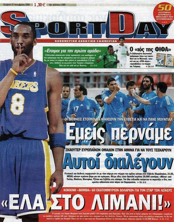 ” Ο Ολυμπιακός δίνει 60 εκατομμύρια δολάρια για τριετές συμβόλαιο στον Kobe Bryant. Του προσφέρει επίσης μπάτλερ, σοφές, όσα χρειάζεται για τα παιδιά του, αλλά και ένα γιοτ μαζί με το πλήρωμα! Εκτός αυτού, θα χτίσουν ιδιόκτητο γήπεδο χωρητικότητας 20.000 θεατών“.