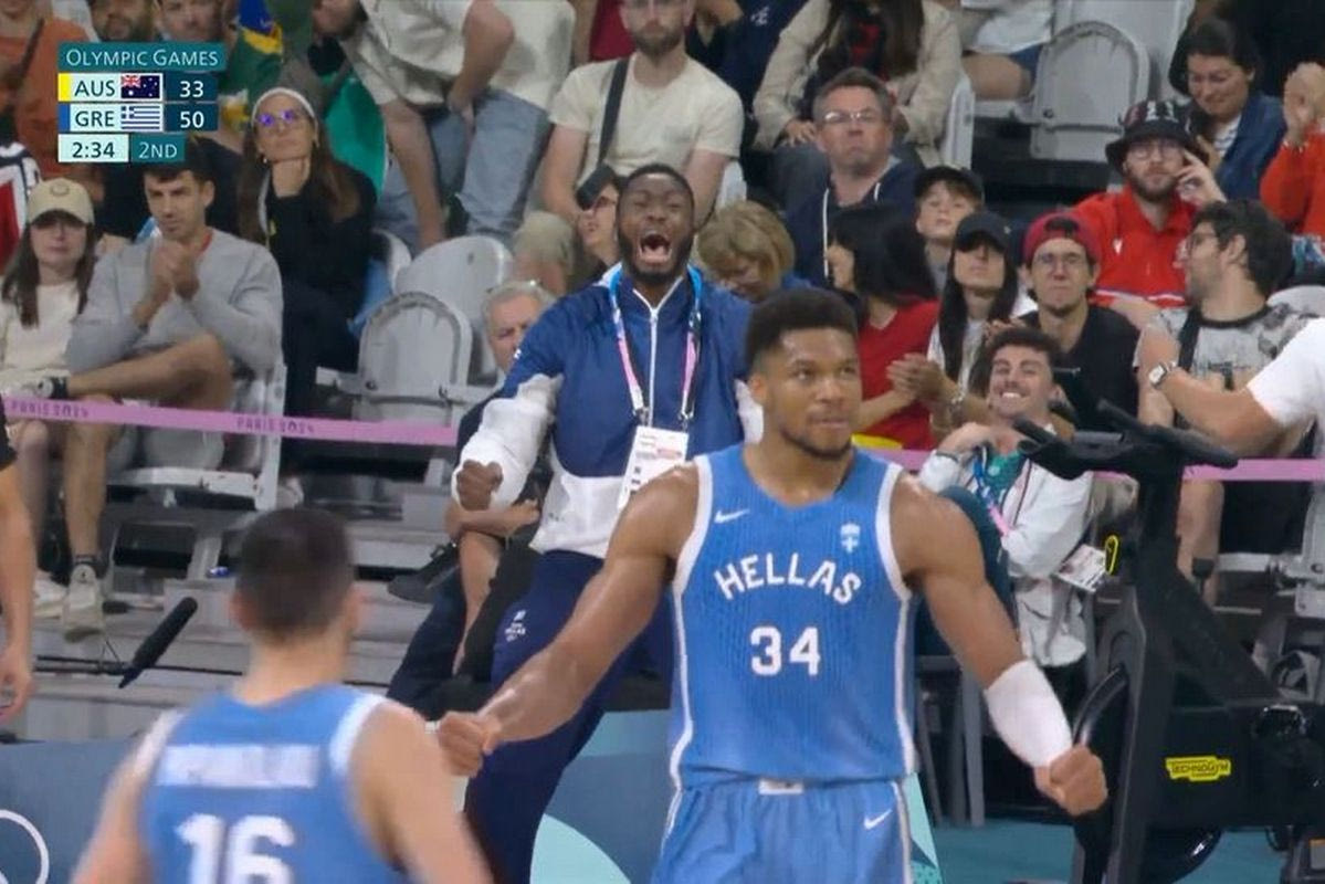 Δείτε το ξέσπασμα του Θανάση Αντετοκούνμπο μετά από το καλάθι που έβαλε ο Γιάννης για να γράψει το 50-33 υπέρ της Ελλάδας στα 2'34" πριν το ημίχρονο του αγώνα με την Αυστραλία.