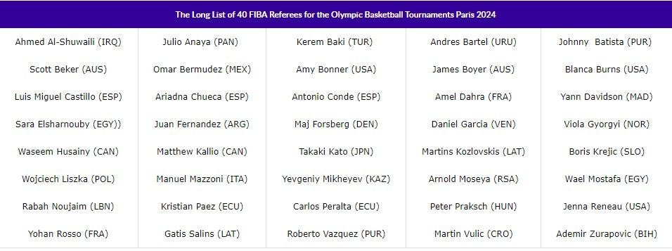 Χωρίς Έλληνες διαιτητές θα διεξαχθούν οι Ολυμπιακοί Αγώνες του 2024 όπως προέκυψε από τη λίστα των 40 ονομάτων που δημοσίευσε η FIBA αναφορικά με το τουρνουά του μπάσκετ.