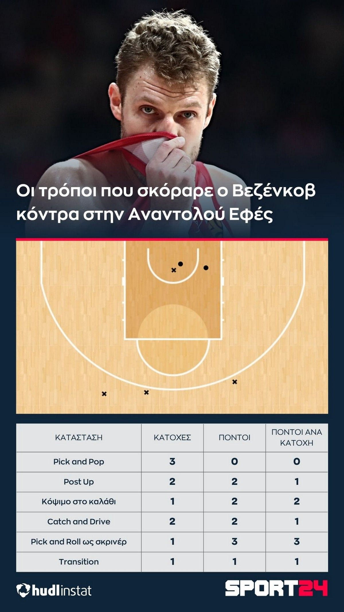 Αυτό δεν είναι υπερβολή.Σχεδόν σε όλα τα plays της η Εφές ενέπλεκε τον Βεζένκοβ, αφού ήταν ο δικός του παίκτης που έκανε σκριν. Αν ο Ολυμπιακός άλλαζε, τότε ο χειριστής της μπάλας έκανε επίθεση στον Βεζένκοβ. Αν ο Ολυμπιακός δεν άλλαζε, τότε η μπάλα περνούσε στον ψηλό που μάρκαρε ο Βεζένκοβ. Σύμφωνα με το Hudl Instat, ο Βεζένκοβ ήταν ο κύριος αμυντικός σε 16 επιθέσεις της Εφές, με την τουρκική ομάδα να σημειώνει 16 πόντους απέναντί του. Και όλα αυτά χωρίς να λαμβάνονται υπόψη οι φάσεις που τελικά ενεπλάκη ο σταρ των “ερυθρολεύκων” στα πρώτα δευτερόλεπτα και τελικά την επίθεση την πήρε άλλος παίκτης.