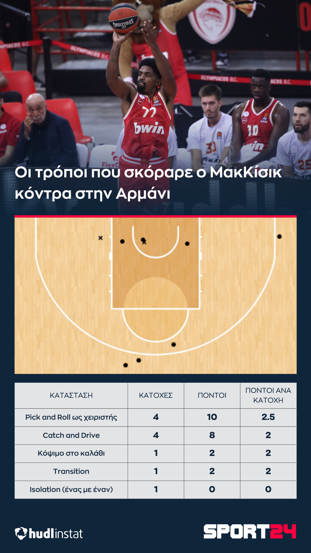Ο ΜακΚίσικ είναι άλλος παίκτης όταν έχει χώρους. Είναι επίσης άλλος παίκτης αν βάλει τα πρώτα ένα-δύο καλάθια του και βρει ρυθμό. Τότε είναι που αποκτά αυτοπεποίθηση και – ειδικά στο ΣΕΦ – μπορεί να σουτάρει και από την περιφέρεια. Κόντρα στην Αρμάνι, ο Αμερικανός ήταν το αντίβαρο του Βεζένκοβ. Αυτός δηλαδή που κουβάλησε τον Ολυμπιακό στο σκοράρισμα όταν ο Βεζένκοβ ήταν στον πάγκο.