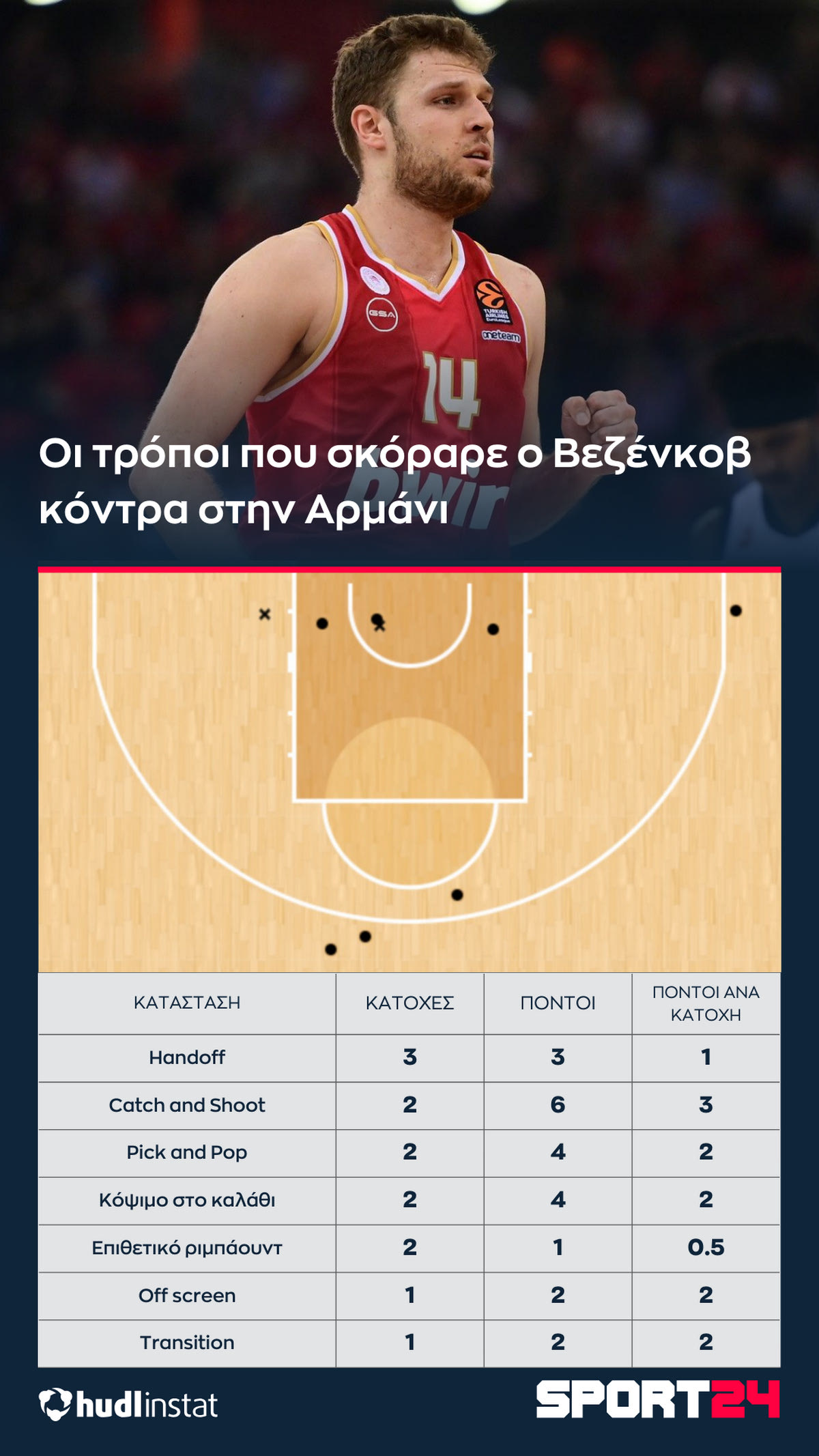 Ολυμπιακός – Αρμάνι Μιλάνο: Οι 22 πόντοι με τέσσερις ντρίμπλες του Βεζένκοβ, ο ΜακΚίσικ που ισορρόπησε την 2η πεντάδα και το +16 του Παπανικολάου