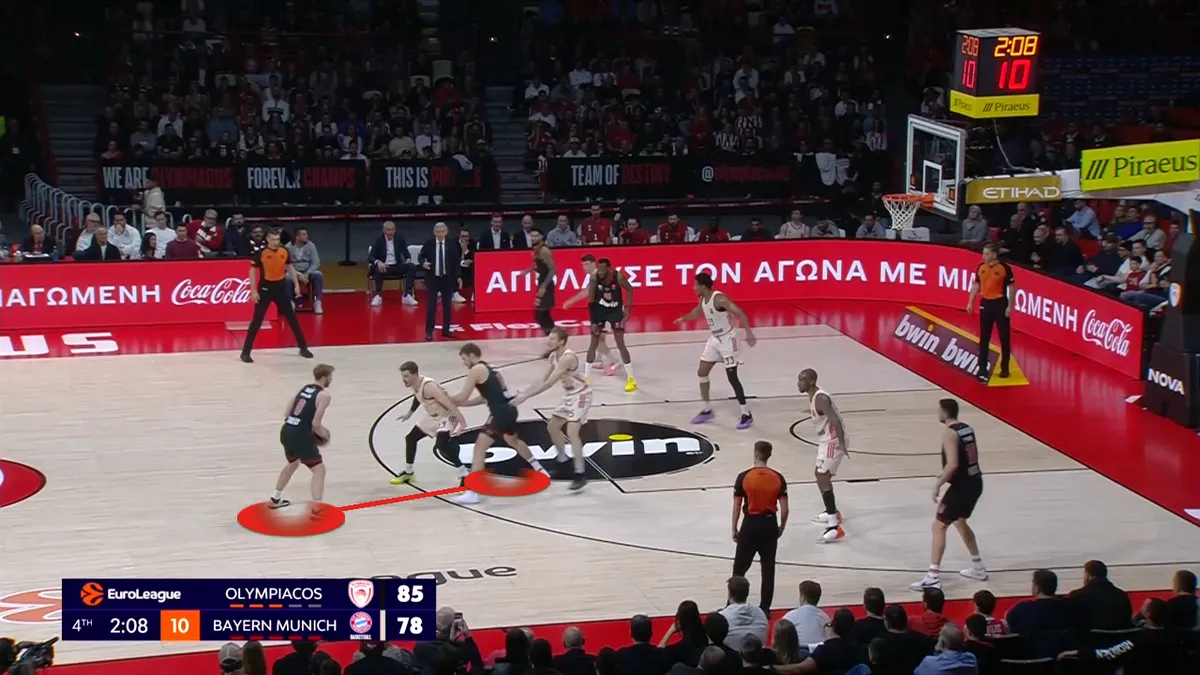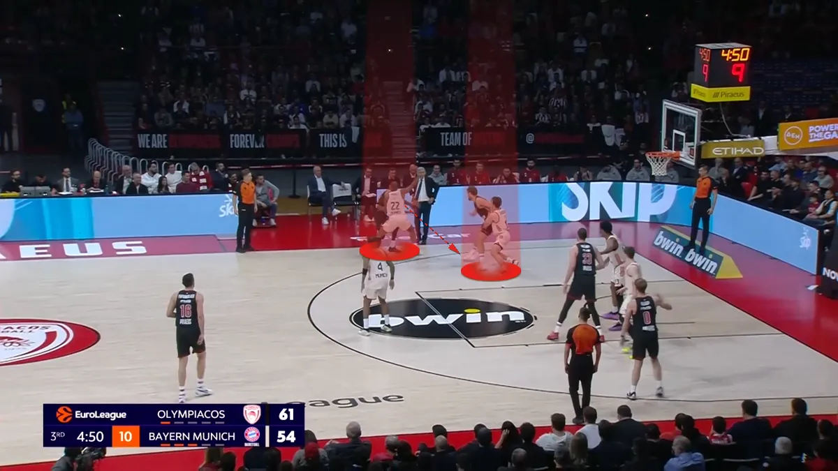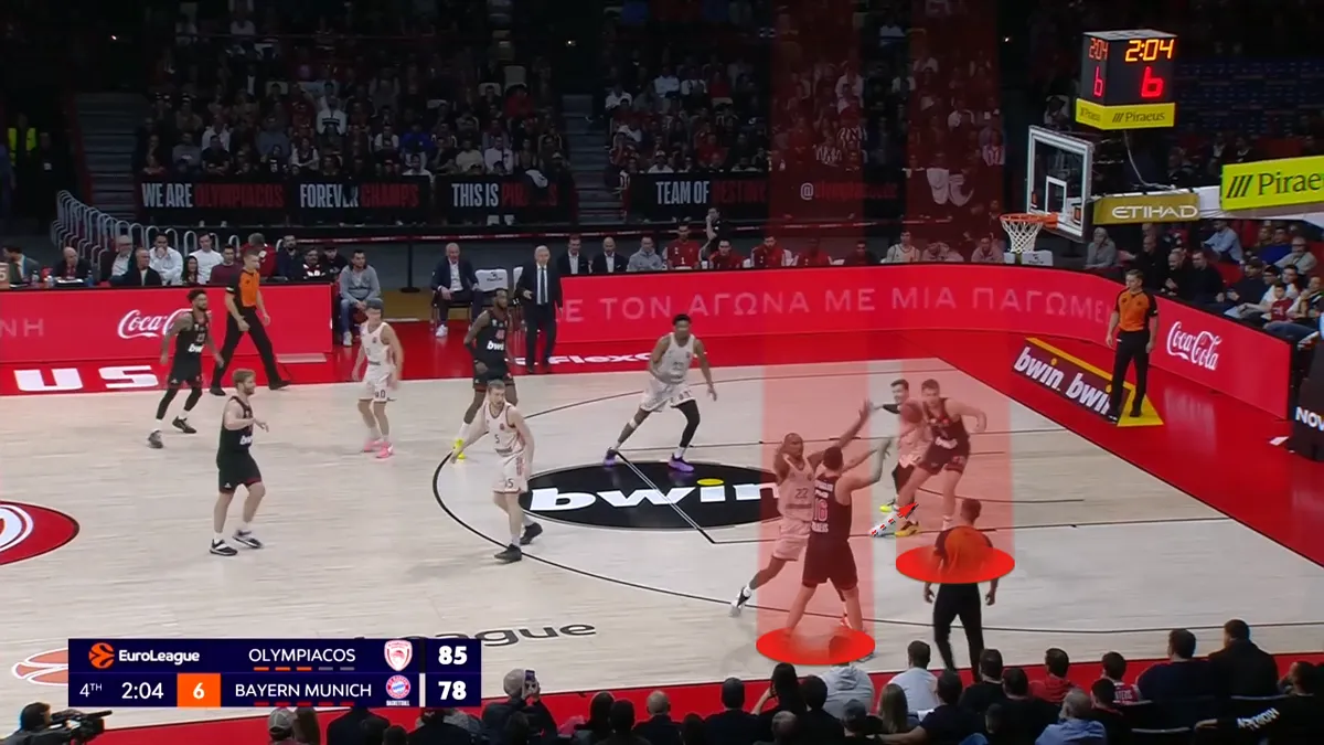 Η Μπάγερν ήθελε να δώσει βοήθειες στα Post Up του Βεζένκοβ. Ο Ολυμπιακός ωστόσο φρόντιζε να τον τροφοδοτήσει σε σημεία που ήταν δύσκολο να έρθει βοήθεια, ενώ άλλες φορές απλώς ο Βεζένκοβ εκτελούσε γρήγορα. Ιδού ένα πρώτο παράδειγμα:
