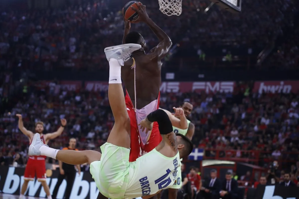 Ο Μπίλι Ερνανγκόμεθ έσκισε τη φανέλα του Μουσταφά Φαλ πέφτοντας έπειτα από μια μονομαχία των δύο στο τέταρτο δεκάλεπτο του αγώνα του Ολυμπιακού με την Μπαρτσελόνα στο ΣΕΦ.