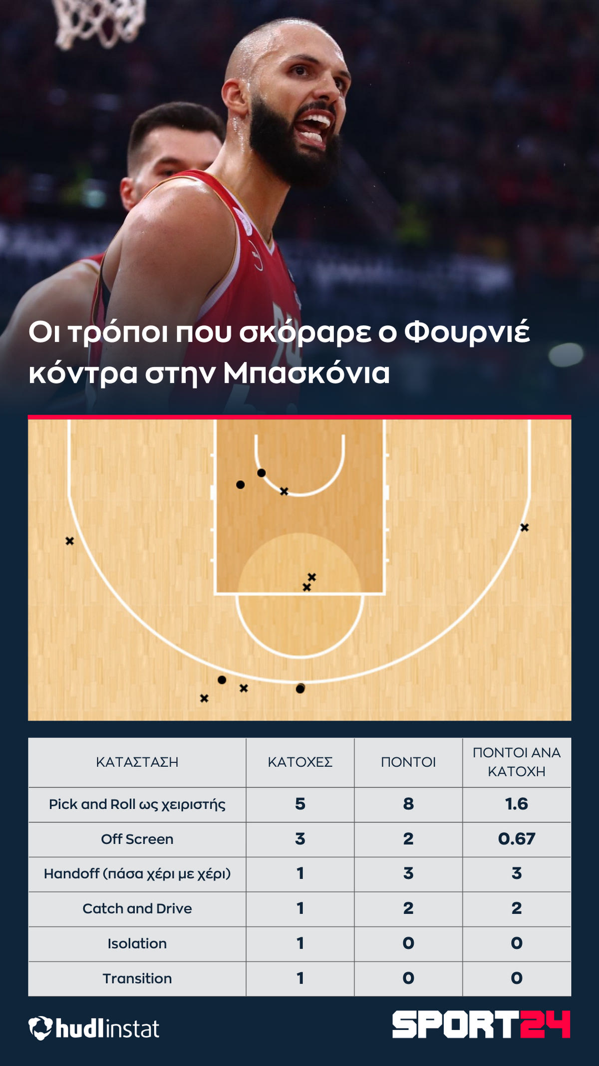 Ο Φουρνιέ άνοιξε το γήπεδο. Υποχρέωσε την Μπασκόνια να αλλάξει προσέγγιση στο Pick and Roll (όπου για ο ψηλός της έμενε πίσω, δίνοντάς του το σουτ). Τότε ήταν που αποφάσισε να αναλάβει ρόλο δημιουργού, μοιράζοντας το παιχνίδι, για αυτό και τελείωσε τον αγώνα με 15 πόντους και 9 ασίστ. Σύμφωνα με το Hudl Instat, αυτές οι 9 ασίστ έδωσαν άλλους 18 πόντους. Κοινώς, ήταν υπεύθυνος συνολικά για 33 πόντους του Ολυμπιακού.