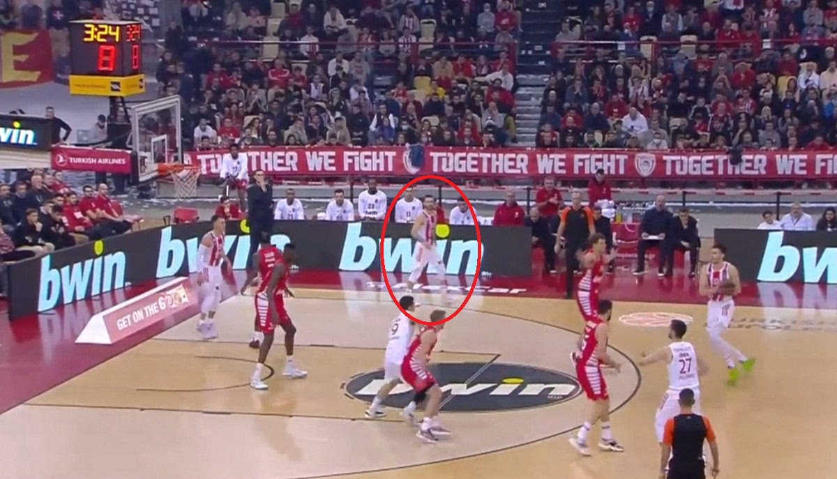 Ο Ολυμπιακός στο πρώτο 8λεπτο του αγώνα έμεινε πιστός στην λογική του να παίζει “Flat” στο Pick and Roll όταν εμπλεκόταν ο σέντερ (ο ψηλός έμενε πίσω στο σκριν) και στις αλλαγές από τις θέσεις 1 έως 4. Ο Μπόλομποϊ όμως δεν έχει το εκτόπισμα του Φαλ.