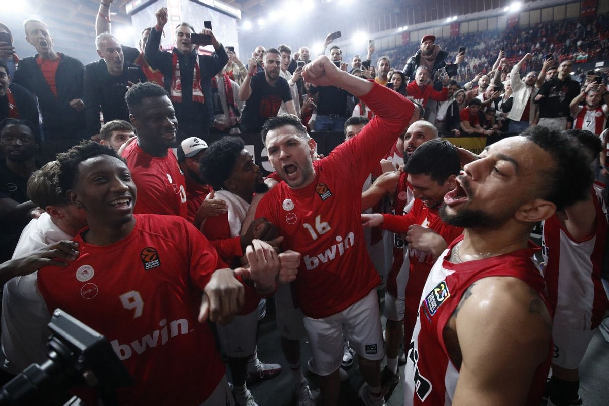 Ολυμπιακός: Έξαλλοι πανηγυρισμοί των παικτών με τον κόσμο στο κατάμεστο ΣΕΦ μετά τη νίκη επί της Παρτίζαν