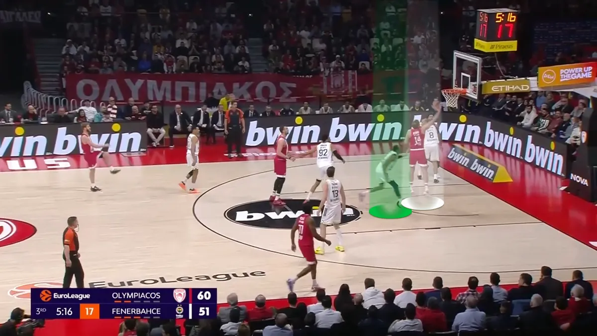*Με κυκλάκι τα εύστοχα σουτ, με “x” τα άστοχαΟ Γάλλος ήταν μαγικός, βρίσκοντας τους πρώτους πόντους του σε μία off screen κατάσταση (όπου πήγε μέχρι μέσα στο καλάθι) και στην συνέχεια πλήγωσε την Φενέρ σε κατάσταση Pick and Roll – αφού η τουρκική ομάδα έβαλε αρχικά τους ψηλούς της να παίζουν Flat, δίνοντας το σουτ. Όταν πλέον η τουρκική ομάδα πήγε στις αλλαγές, ήταν πια αργά: Ο Γάλλος είχε βρει ρυθμό και σκόραρε όπως και όποτε ήθελε.