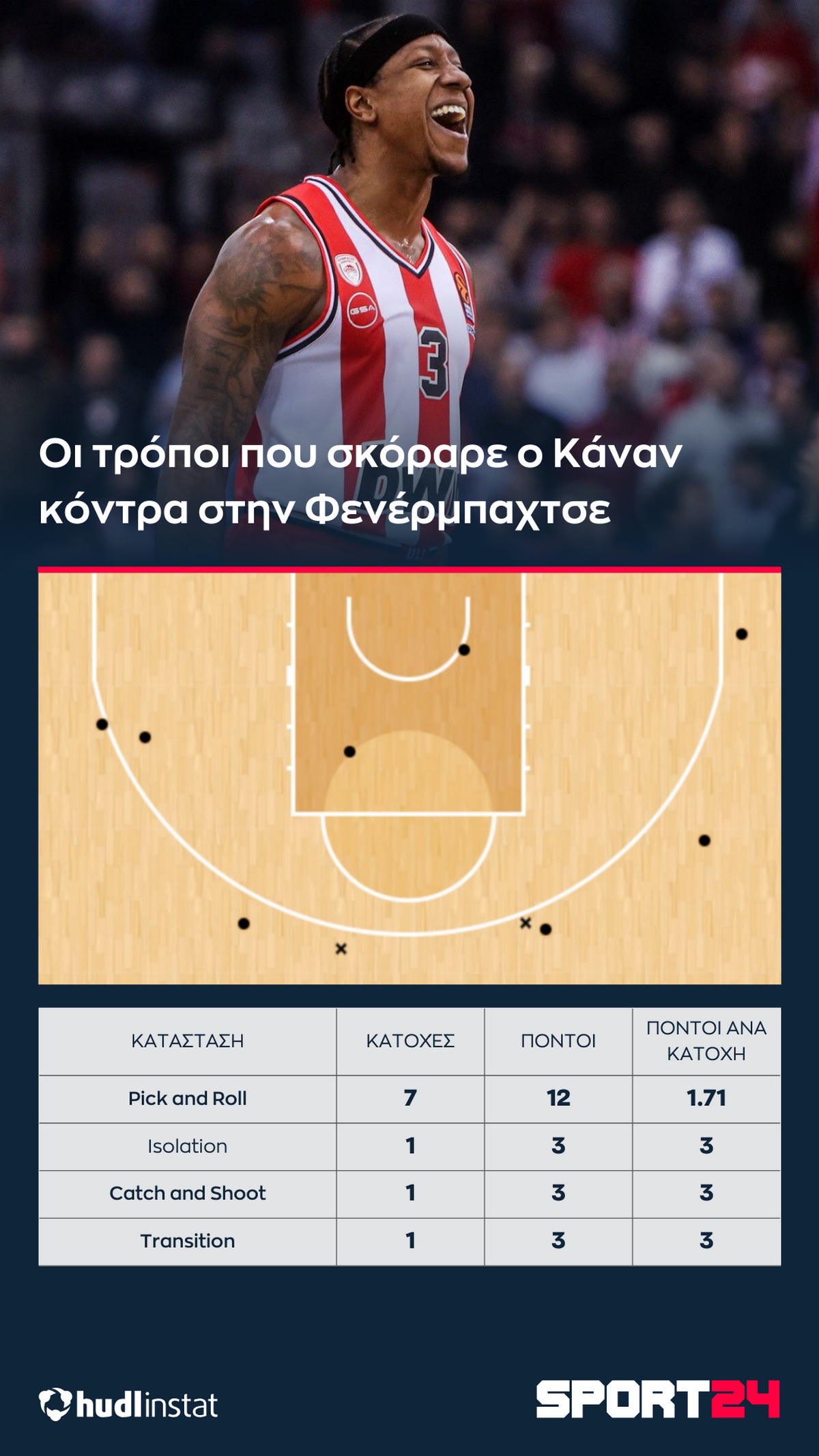 Η Φενέρ τα έκοψε όλα αυτά στον Ολυμπιακό (για αυτό και εξουδετερώθηκε και ο Πίτερς λόγω του μαρκαρίσματος του Χέιζ-Ντέιβις, αφού τρέφεται από την καλή κυκλοφορία της ομάδας) Ο Ολυμπιακός δεν έχει χτιστεί για να επιτίθεται συνεχώς σε κατάσταση Pick and Roll με τον χειριστή να παίρνει την προσπάθεια. Η Φενέρ παραδοσιακά τον οδηγεί σε αυτό τον δρόμο για αυτό τον δυσκολεύει. Χθες (12/4) ωστόσο ο Ολυμπιακός – βασικά ο Κάναν – βρήκε λύσεις σε αυτό τον τομέα. Σύμφωνα με το Hudl Instat, οι “ερυθρόλευκοι” εκδήλωσαν 20 επιθέσεις σε κατάσταση Pick and Roll όπου το σουτ πήρε ο χειριστής και πήραν 22 πόντους, με 12 από αυτούς να έρχονται από τον Κάναν. Αυτό έκανε και την διαφορά.