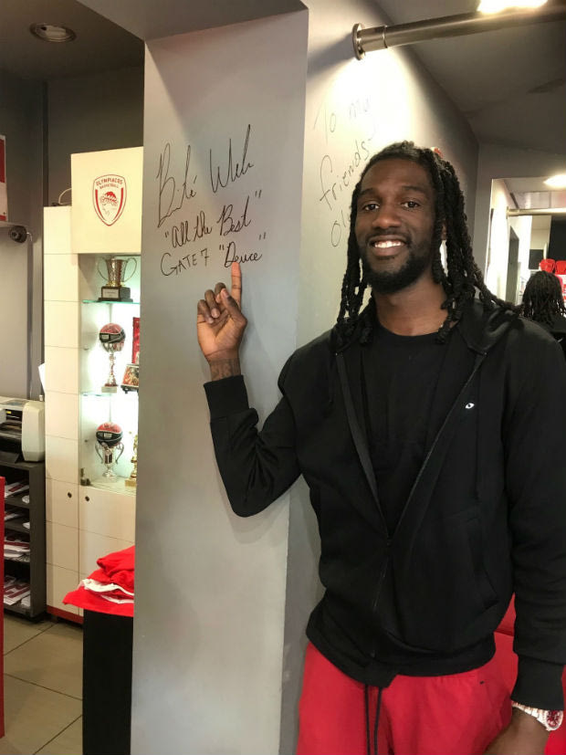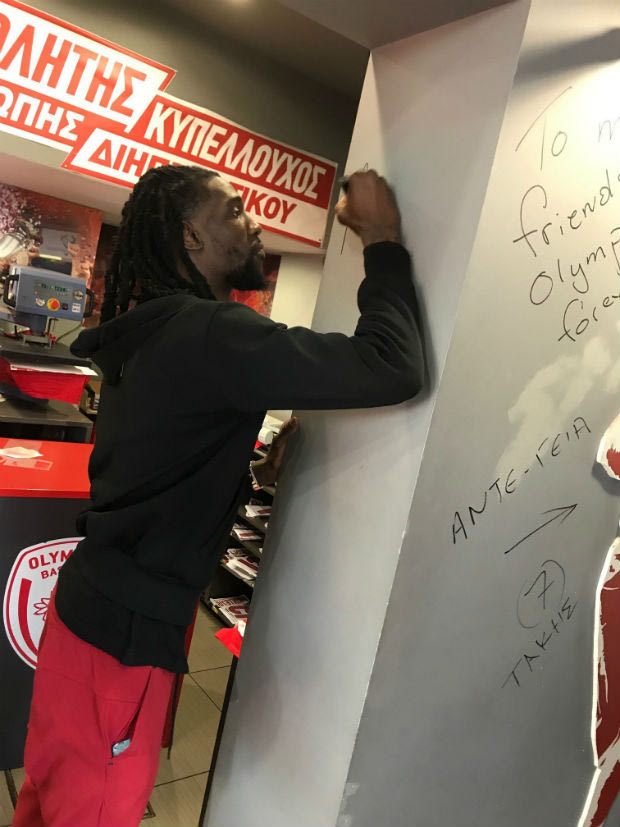 Ο Αμερικανός γκαρντ του Ολυμπιακού έκανε τα ψώνια του, ενώ δεν παρέλειψε να αφήσει και την αφιέρωσή του στον τοίχο του καταστήματος, όπως κατά καιρούς έχουν πράξει και οι περισσότεροι παίκτες που έχουν φορέσει την φανέλα των ερυθρολεύκων και να ευχηθεί ό,τι καλύτερο ενόψει της συνέχειας της σεζόν.
