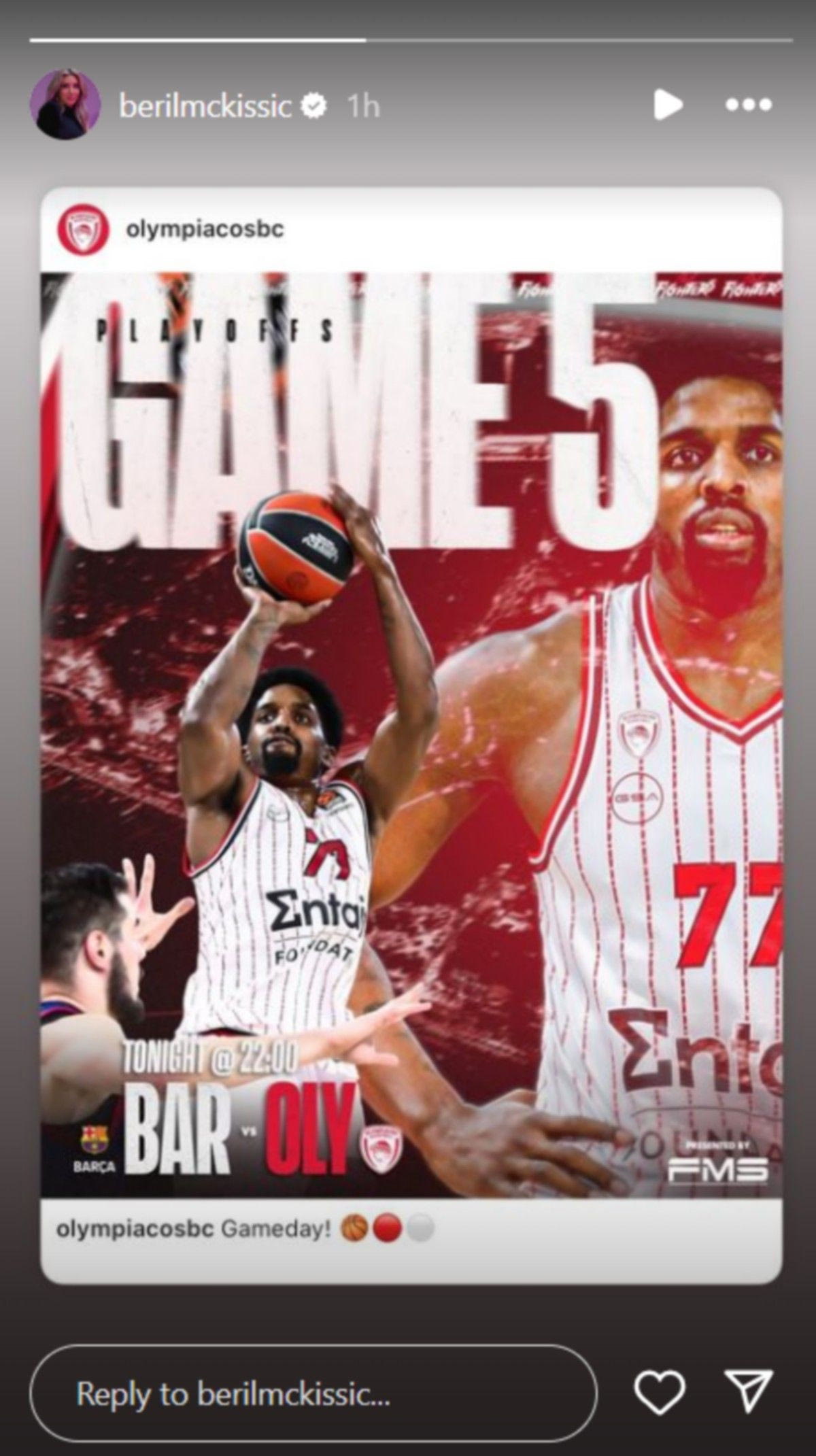 Συγκεκριμένα, η σύντροφος του Αμερικανού μπασκετμπολίστα της ομάδας του Γιώργου Μπαρτζώκα ανήρτησε την δημοσίευση της επίσης σελίδας του Ολυμπιακού για τον σημερινό (8/5) αγώνα στην Ισπανία.