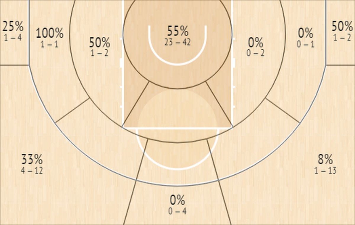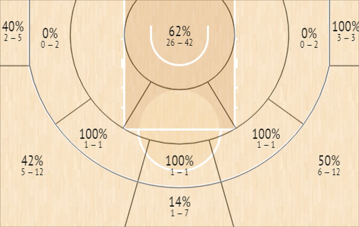 Ο Γιώργος Μπαρτζώκας έδωσε την μπάλα στον Αμερικανό όταν ο Ολυμπιακός είχε κολλήσει στο σκορ στο πρώτο ημίχρονο και δικαιώθηκε. Ο Αμερικανός έπαιξε το δικό του παιχνίδι, έκανε άνω-κάτω το ματς και έδωσε ανάσες στους “ερυθρόλευκους”. Το δε Shot Chart του είναι χαρακτηριστικό της επιρροής του στο ματς: