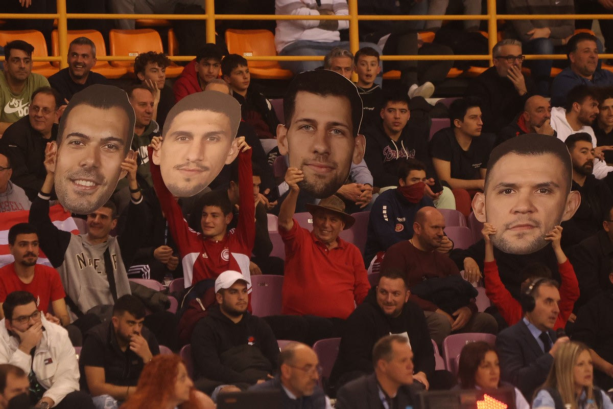 Τέσσερις φίλοι του Ολυμπιακού έκλεψαν την παράσταση στον προημιτελικό του Κυπέλλου Ελλάδας ΟΠΑΠ με τον Άρη, χάρη σε αυτό που έφεραν μαζί στο γήπεδο. Τι ήταν αυτό; Τα πρόσωπα των Κώστα Σλούκα, Κώστα Παπανικολάου, Γιαννούλη Λαρεντζάκη και Μιχάλη Λούντζη σε μεγέθυνση.