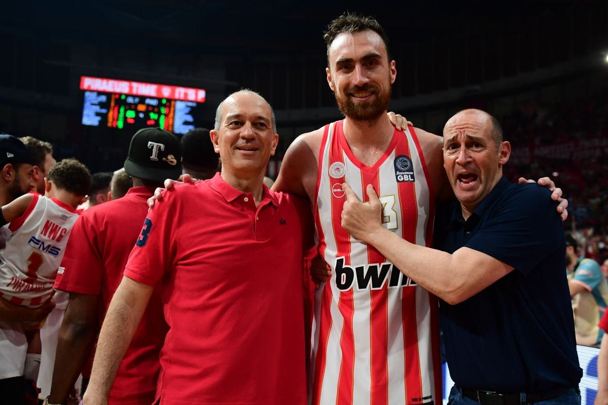 Η φωτογραφία των αδελφών Αγγελόπουλων με τον Νίκολα Μιλουτίνοβ, μετά την κατάκτηση της Stoiximan GBL από τον Ολυμπιακό.