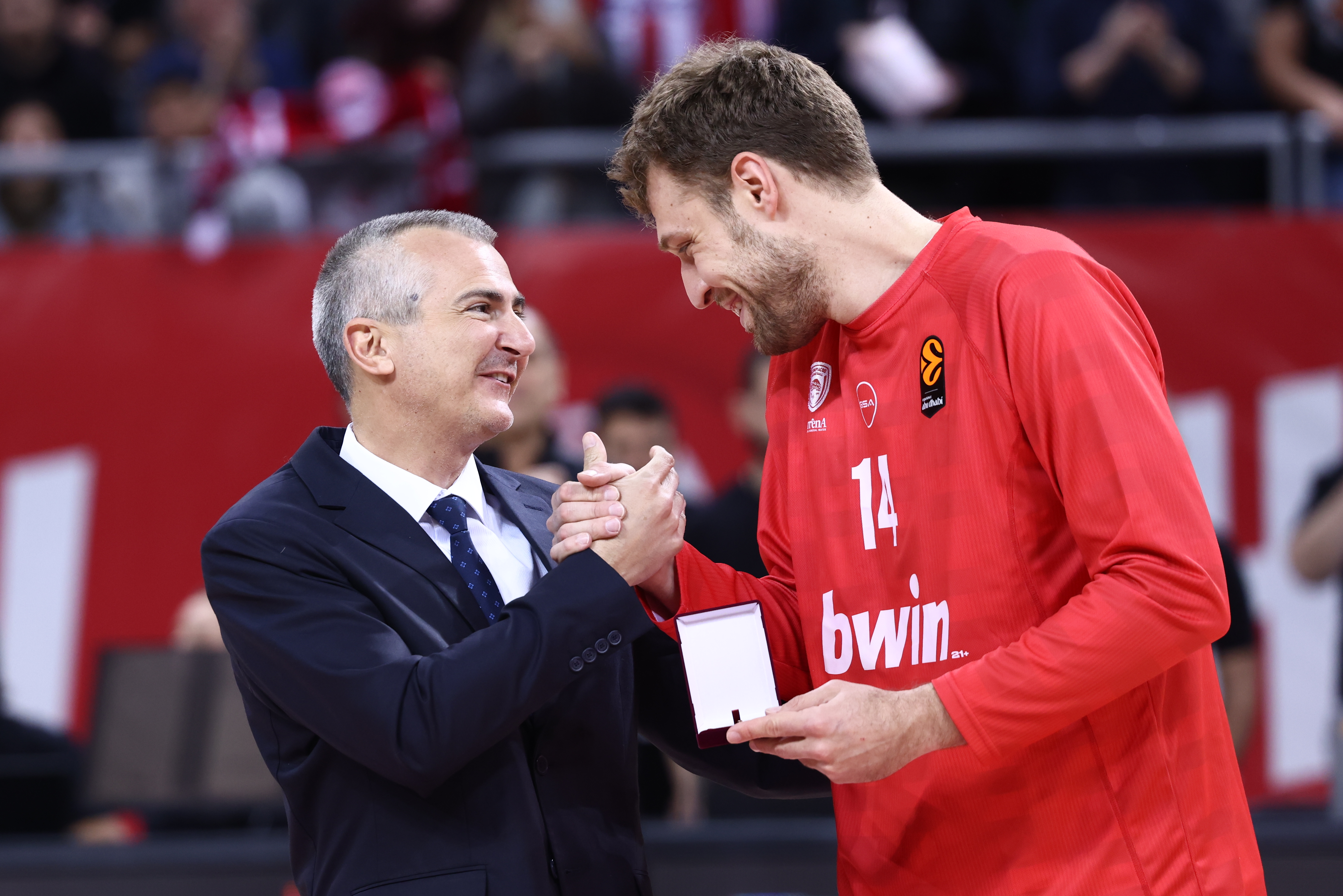 Ο Σάσα Βεζένκοβ βραβεύτηκε από τον Υπουργό Αθλητισμού της Βουλγαρίας, Ντίμιταρ Ιλίεβ, πριν το τζάμπολ του Χάποελ – Ολυμπιακός, στο πλαίσιο της 37ης αγωνιστικής της EuroLeague.