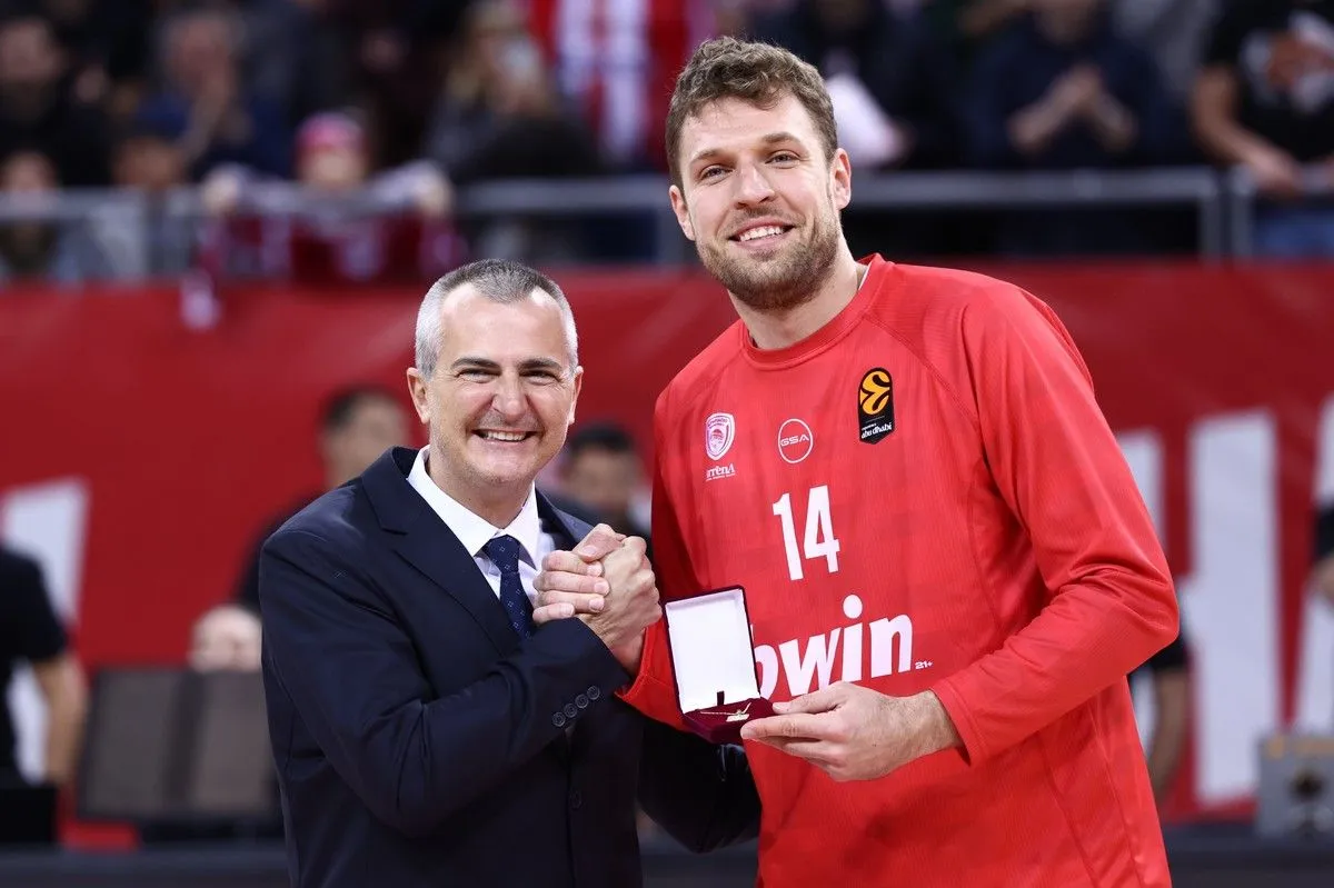 Ολυμπιακός: Η βράβευση του Σάσα Βεζένκοβ από τον Υπουργό Αθλητισμού της Βουλγαρίας πριν το τζάμπολ του ματς