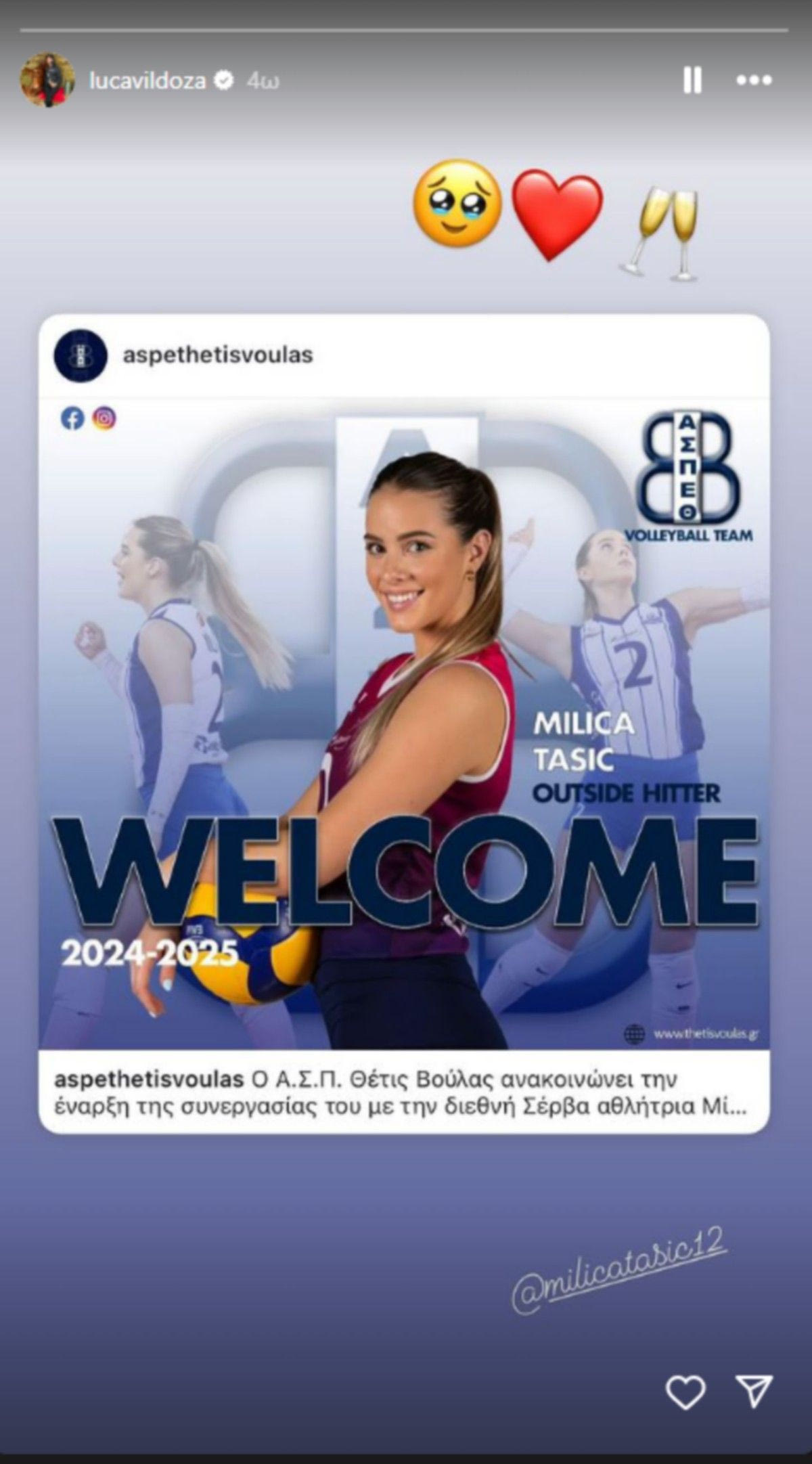 Και αυτό γιατί, η σύντροφός του, η Σέρβα βολεϊμπολίστρια, Μιλίτσα Τάσιτς, θα αγωνιστεί την ερχόμενη σεζόν στην Volley League γυναικών, για λογαριασμό της Θέτιδας Βούλας, που ανακοίνωσε την συνεργασία τους.