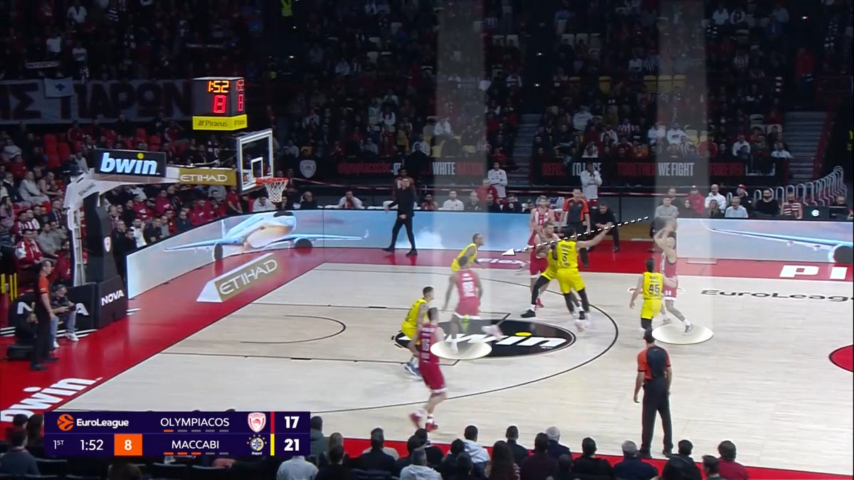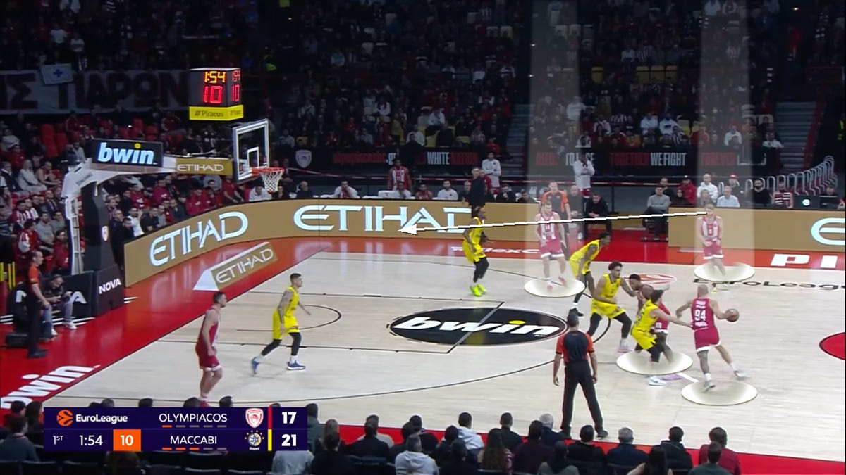 Ο Φουρνιέ παίρνει σκριν από τον Τζόουνς, ενώ ο Βεζένκοβ κάνει back screen στον Γουόκαπ για να απασχολήσει την άμυνα της Μακάμπι.