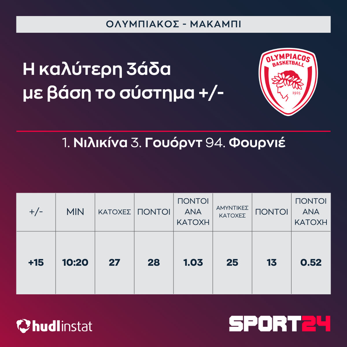 Τα αθλητικά προσόντα – και το μέγεθος – των Νιλικίνα, Γουόρντ απελευθέρωσαν τον Φουρνιέ, που συνδύασε ιδανικά τον ρόλο δημιουργού και εκτελεστή, τελειώνοντας το ματς με 12 πόντους και 9 ασίστ, που έδωσαν άλλους 20 πόντους στον Ολυμπιακό. Κοινώς, ήταν υπεύθυνος για 32 πόντους της ομάδας του.