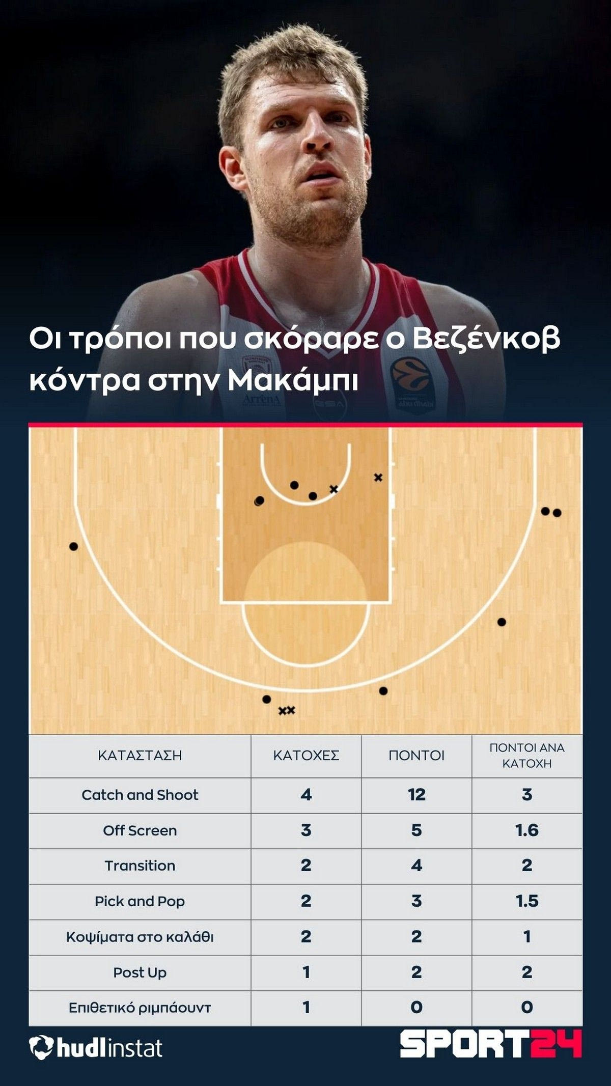 Ο Βεζένκοβ είδε ότι ο Ολυμπιακός είχε ανάγκη από τους πόντους του και πήρε από το χέρι την ομάδα του. Άνοιξε το γήπεδο με το σουτ του, κινήθηκε μακριά από την μπάλα, δημιουργησε προϋποθέσεις για τους “ερυθρολεύκους” να σκοράρουν επειδή απασχολούσε την αντίπαλη άμυνα. Επιβεβαίωσε έτσι για ακόμα μία φορά ότι βρίσκεται σε εξαιρετική κατάσταση.