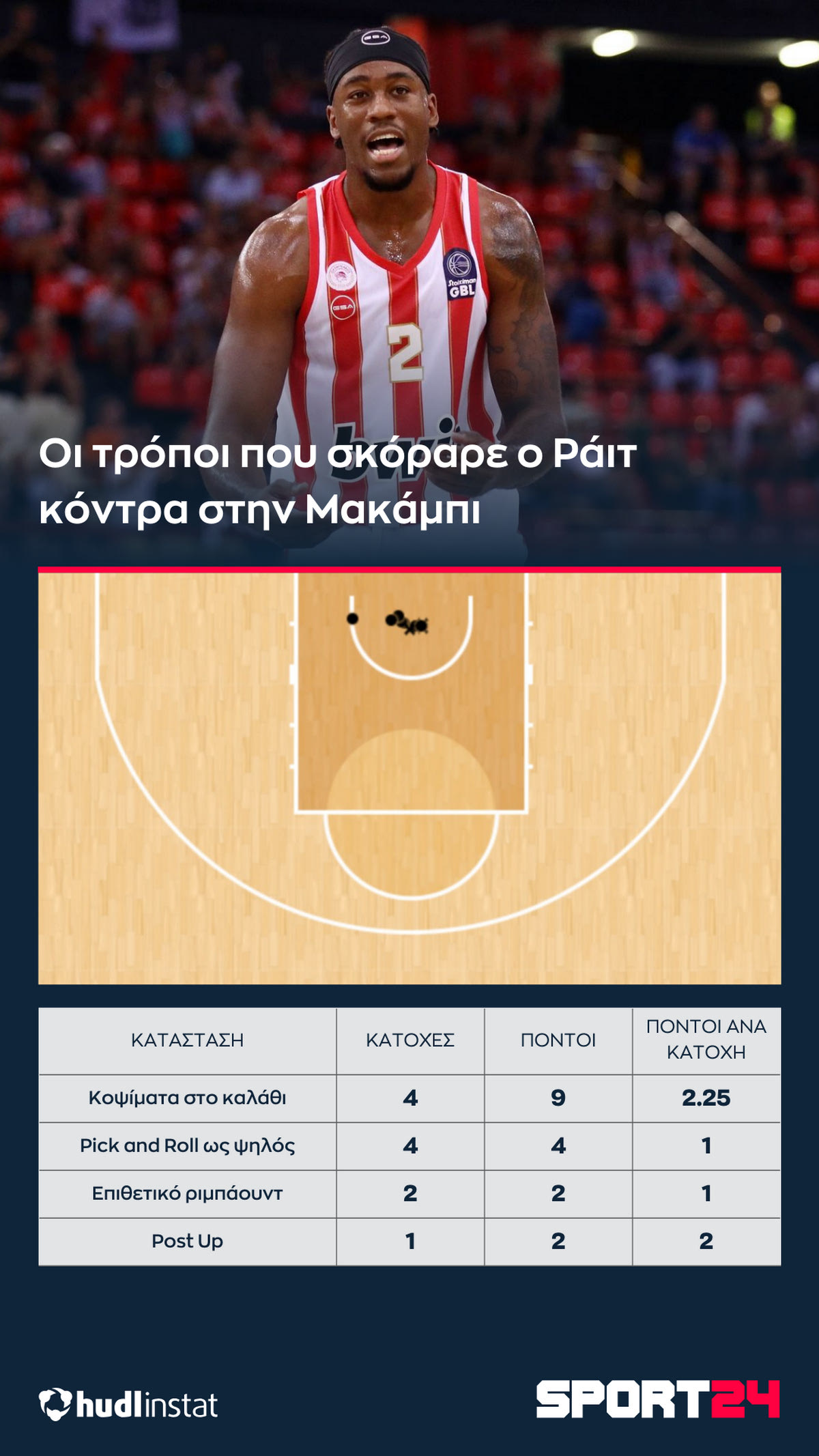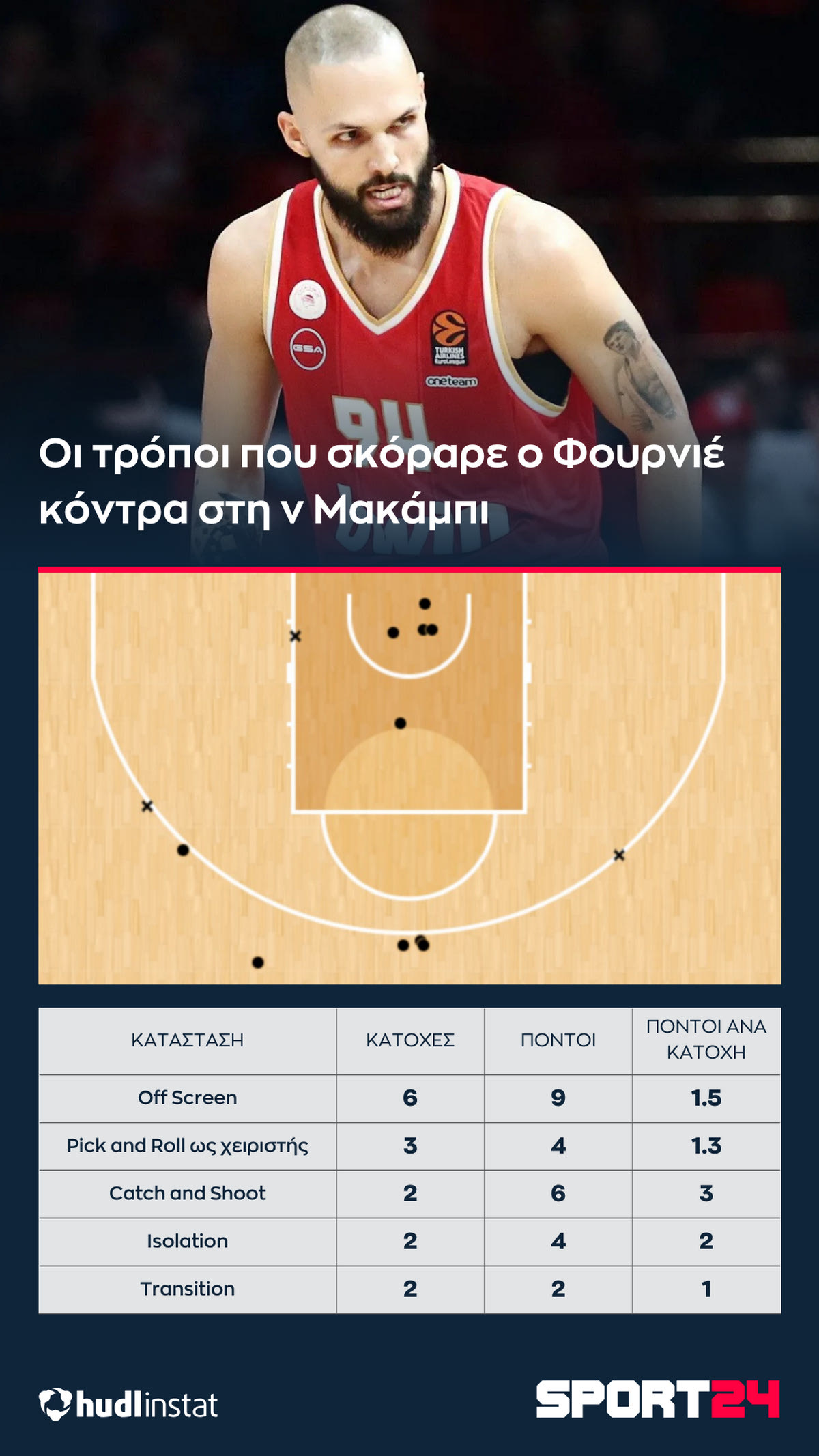 Ο Στέφανος Μακρής αναλύει με την βοήθεια του Hudl Instat την νίκη του Ολυμπιακού επί της Μακάμπι. Η κλάση του Φουρνιέ και τα σουτ που πήρε σε κατάσταση Off screen, οι 32 πόντοι από τις 13 ασίστ του Γουίλιαμς-Γκος και ο Ράιτ που θύμισε… Ράιτ.