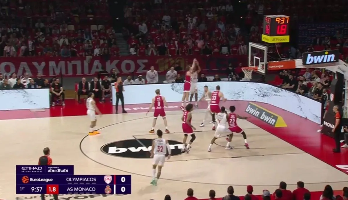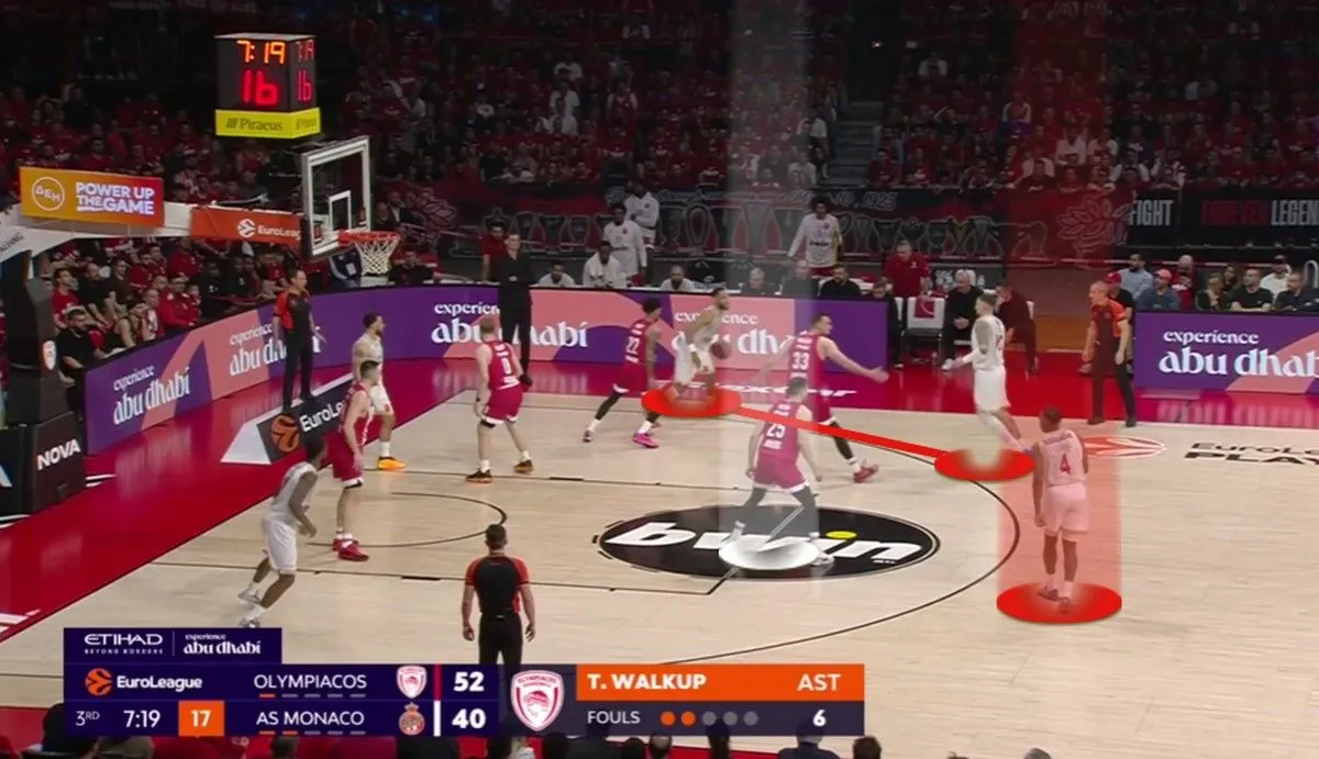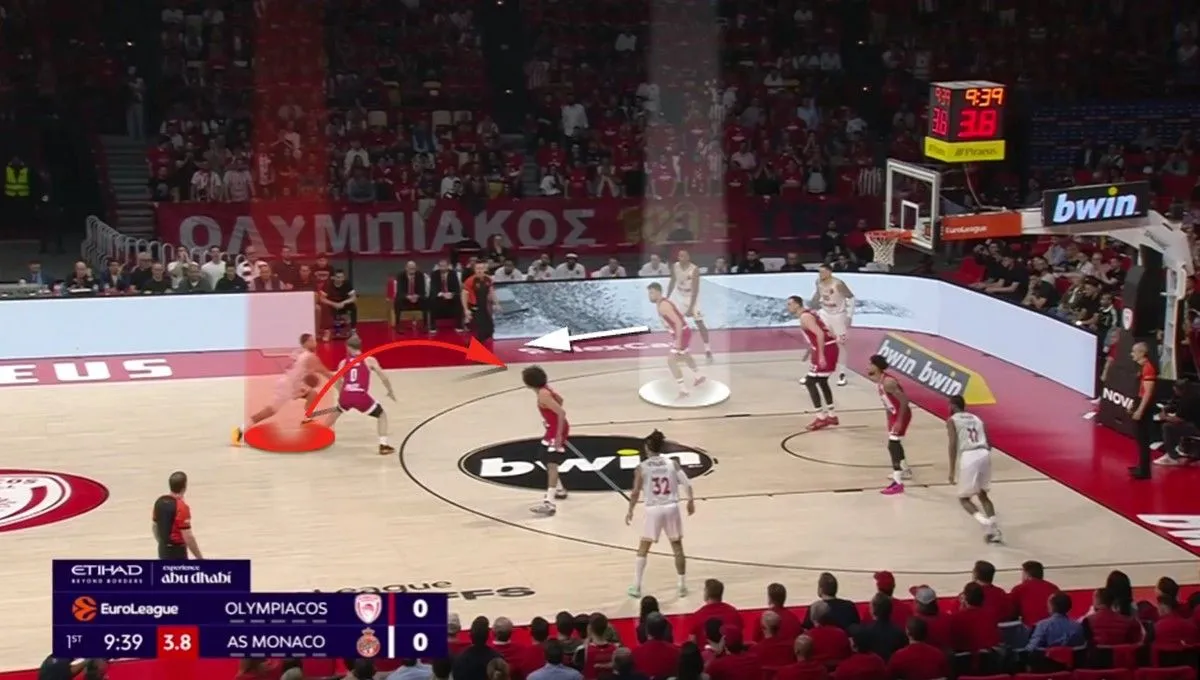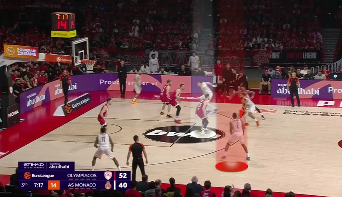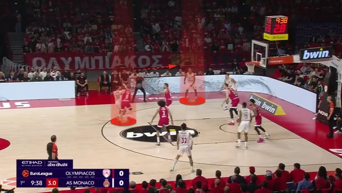Ο Ολυμπιακός σημείωσε 91 πόντους κόντρα στην Μονακό. Η αλήθεια όμως είναι ότι η νίκη ήρθε μέσα από την άμυνά του. Οι “ερυθρόλευκοι” αποφάσισαν να πάνε στην λογική του “Pack the paint” (μετάφραση: Να γεμίσουν την ρακέτα, το “ζωγραφιστό”, όπως λενε στις ΗΠΑ), δίνοντας βοήθεια στο μαρκάρισμα των Τζέιμς, Οκόμπο και Στράζελ κυρίως από τους παίκτες που μάρκαραν τον Μπλόσομγκεϊμ και τον Μπεγκαρίν. Ιδού ένα παράδειγμα, από την πρώτη φάση του αγώνα: