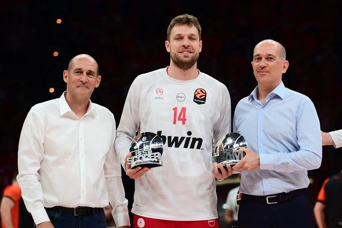 Ολυμπιακός – Μονακό: Ο Σάσα Βεζένκοβ παρέλαβε το βραβείο του MVP και έβγαλε selfie με τους Αγγελόπουλους