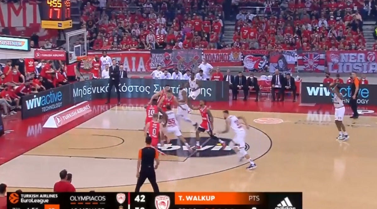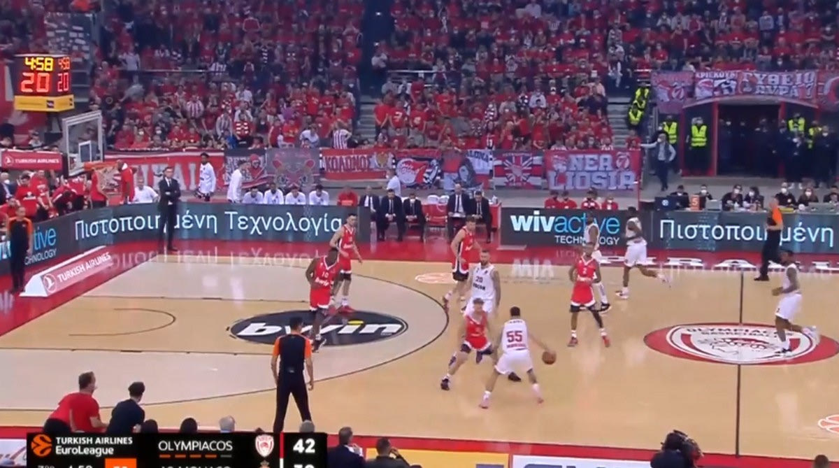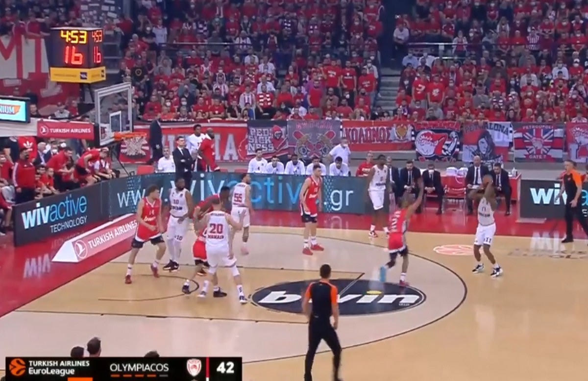Ο Τζέιμς πάει προς το καλάθι και όλη η άμυνα του Ολυμπιακού κλείνει πάνω του printscreen