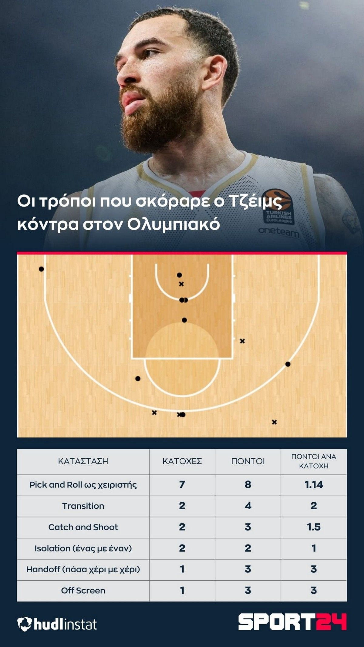 *Με κυκλάκι τα εύστοχα σουτ, με “x” τα άστοχαΟ άλλοτε παίκτης του Λαυρίου πήρε τα σουτ που του αναλογούσαν στο μισό γήπεδο, ενώ έτρεχε στο ανοιχτό γήπεδο όποτε μπορούσε, κάνοντας μεγάλη ζημιά στους Πειραιώτες.