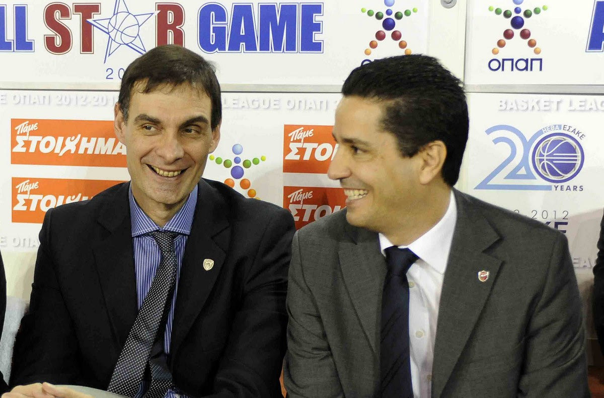 Ο Γιώργος Μπαρτζώκας και ο Γιάννης Σφαιρόπουλος, οι δυο συγχρονοι κορυφαίοι προπονητές του Ολυμπιακού ACTION IMAGES PRESS AGENCY