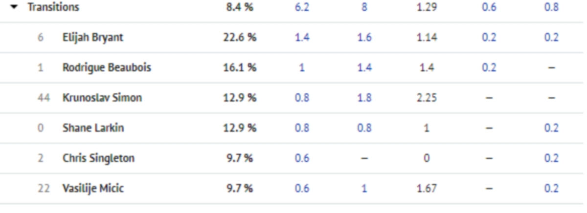 Επίσης ο Μπράιαντ τρέχει περισσότερο από κάθε άλλον την ομάδα του. Με όπλο την ευχέρειά του στο αμυντικό ριμπάουντ (2.8 ανά ματς) δεν χρειάζεται να πάρει την πρώτη πάσα και μεταφέρει άμεσα και γρήγορα την μπάλα στην άλλη πλευρά του παρκέ. Το 22.6% του τρανζίσιον επιβεβαιώνει την ελευθερία που του δίνεται από το σταφ, τη στιγμή που με τον 1.14 πόντο ανά κατοχή την επιστρέφει με… τόκο.