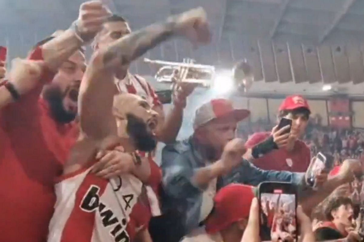 Ο Εβάν Φουρνιέ ανέβηκε στην κερκίδα για να πανηγυρίσει και να τραγουδήσει σύνθημα του Ολυμπιακού μετά τη νίκη στο ντέρμπι αιωνίων επί του Παναθηναϊκού AKTOR.