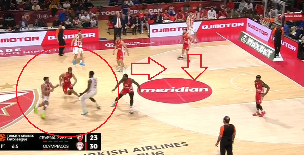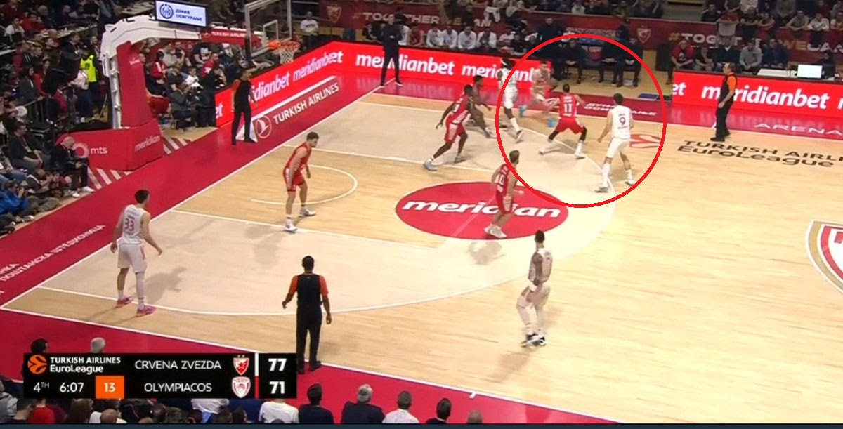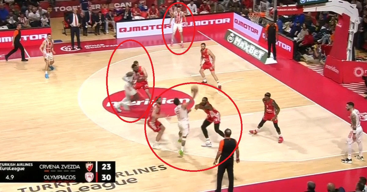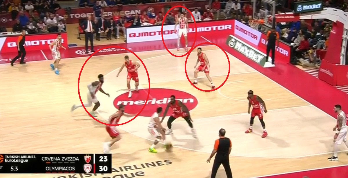 Ο Ολυμπιακός είναι γνωστό ότι στην άμυνα στο Pick and Roll επιλέγει συνήθως να παίξει Flat με τον Μουσταφά Φαλ στο Pick and Roll (μένει πίσω), συχνά επιλέγει “ICE” στις 45 μοίρες (στέλνει τον χειριστή στην πλάγια γραμμή) και αλλαγές. Ο Ερυθρός Αστέρας τιμώρησε από το ξεκίνημα του Ολυμπιακού την λογική του Flat (κυρίως με τον Βιλντόσα) σκοράροντας με σουτ μετά από ντρίμπλα. Ήταν η στιγμή που οι “ερυθρόλευκοι” αποφάσισαν να αλλάξουν κατεύθυνση.
