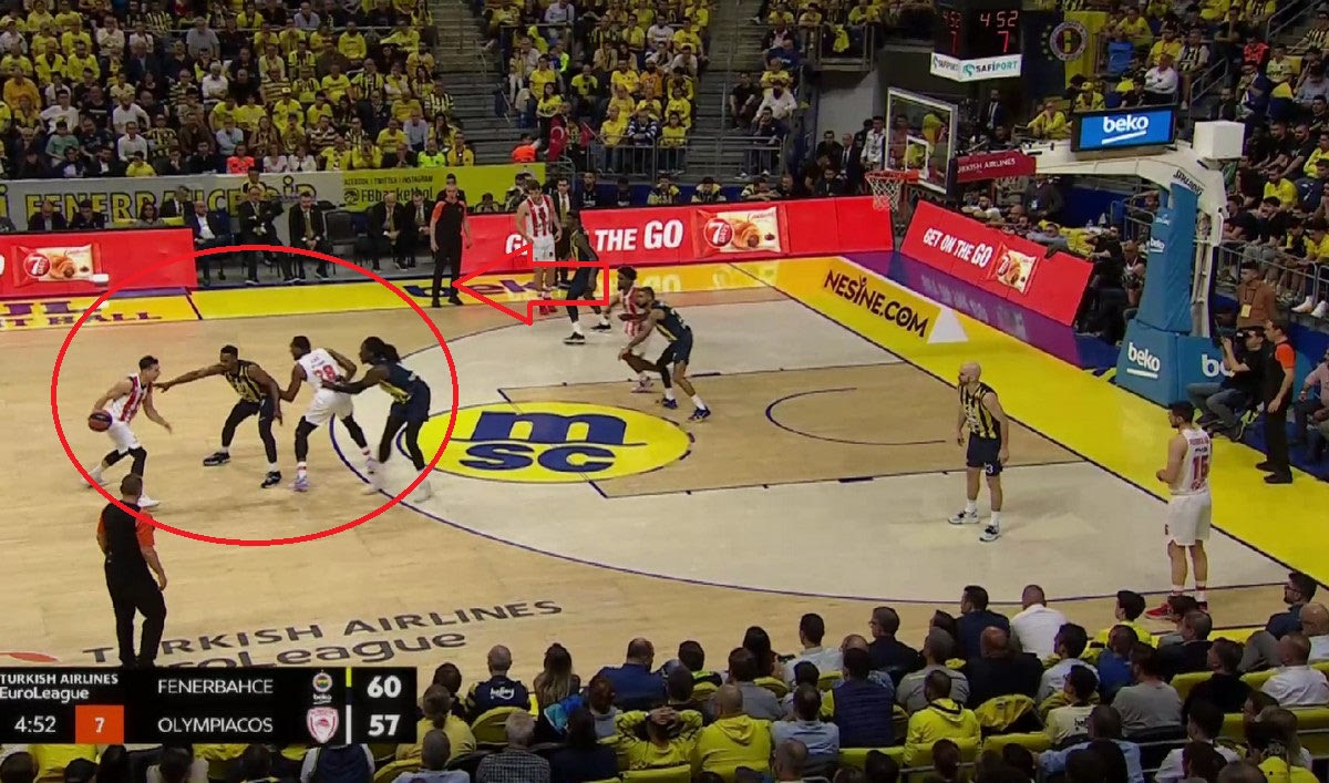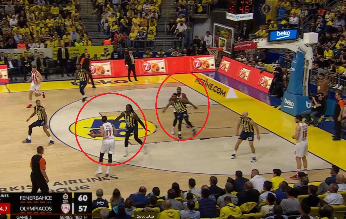 Έχει αναφερθεί αρκετές φορές στο παρελθόν πόσο σημαντικό είναι αυτό το play για τον Ολυμπιακό. Η Φενέρ το ξέρει αυτό και γενικά στα δύο πρώτα παιχνίδια το αντιμετώπισε εξαιρετικά, παίζοντας άμυνα “2 με 2” στο Pick and Roll κάνοντας αλλαγές, βάζοντας τον παίκτη τρίτο αμυντικό που εμπλέκεται στην φάση να ακολουθεί στην περιφέρεια τον τρίτο παίκτη του Ολυμπιακού στην περιφέρεια. Αυτό έγινε και τώρα. Μόνο που ο Ολυμπιακός – και συγκεκριμένα ο Σλούκας (25 πόντοι, 6 ασίστ) – είχε την απάντηση.
