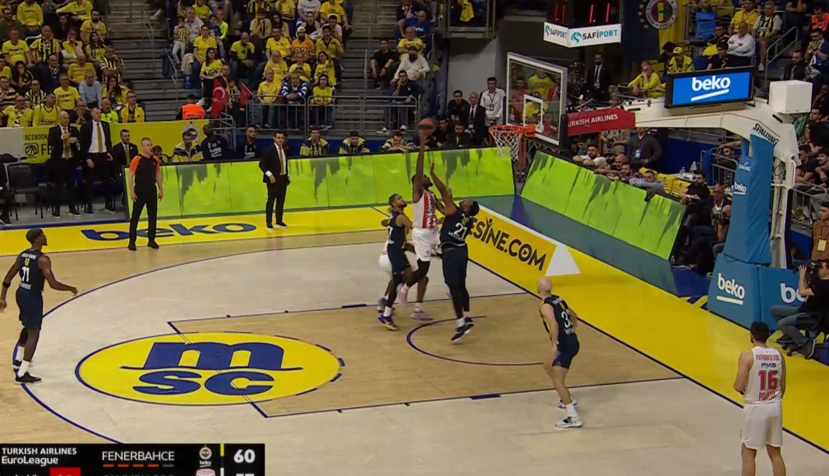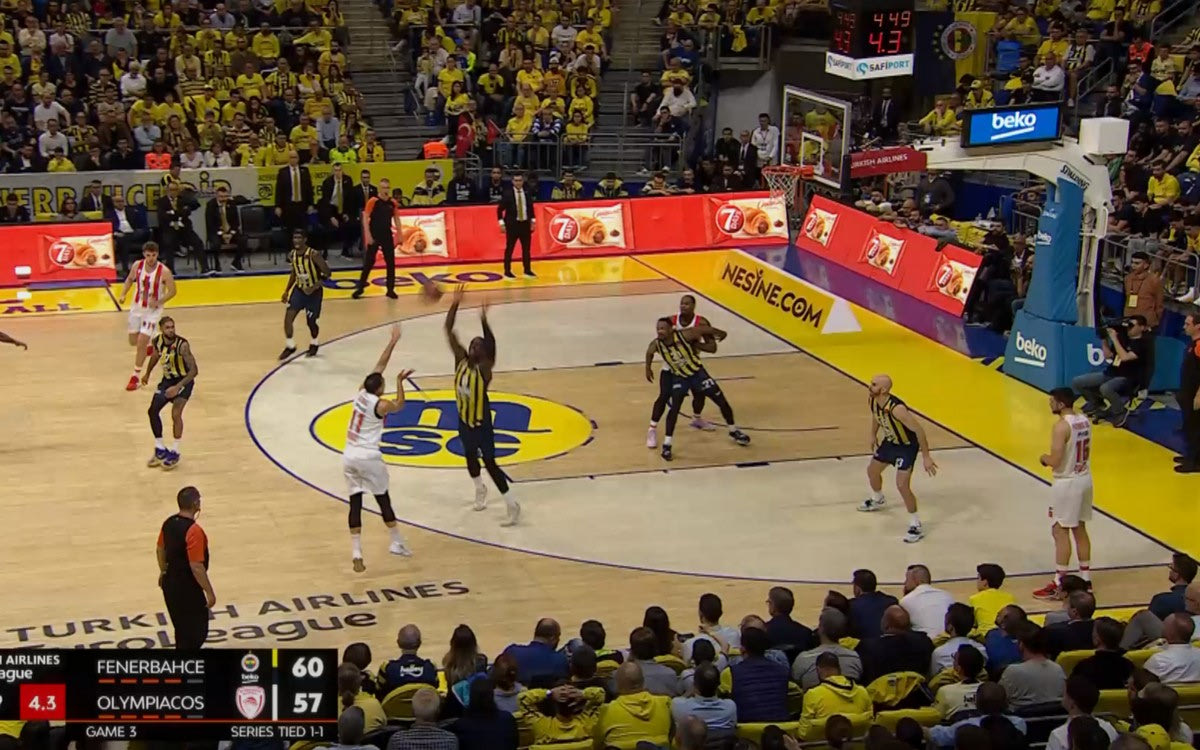 Με την Φενέρ να έχει εστιάσει σε όλο το ματς στην αλλαγή στο αρχικό σκριν του Ολυμπιακού, με το σκορ στο 69-66 ο Ολυμπιακός έβγαλε την καλύτερη φάση του, που έβγαλε το ελεύθερο τρίποντο του MVP της EuroLeague: