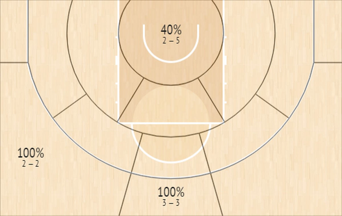 Ο διεθνής γκαρντ ήταν ασταμάτητος, ολοκληρώνοντας τον αγώνα με 23 πόντους με 2/5 δίποντα, 5/5 τρίποντα, 4/4 βολές, 3 ριμπάουντ, 13 ασίστ και 2 κλεψίματα σε 30 λεπτά συμμετοχής. Ιδού και το Shot Chart του από το παιχνίδι: