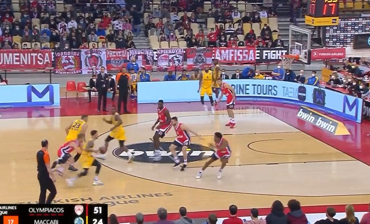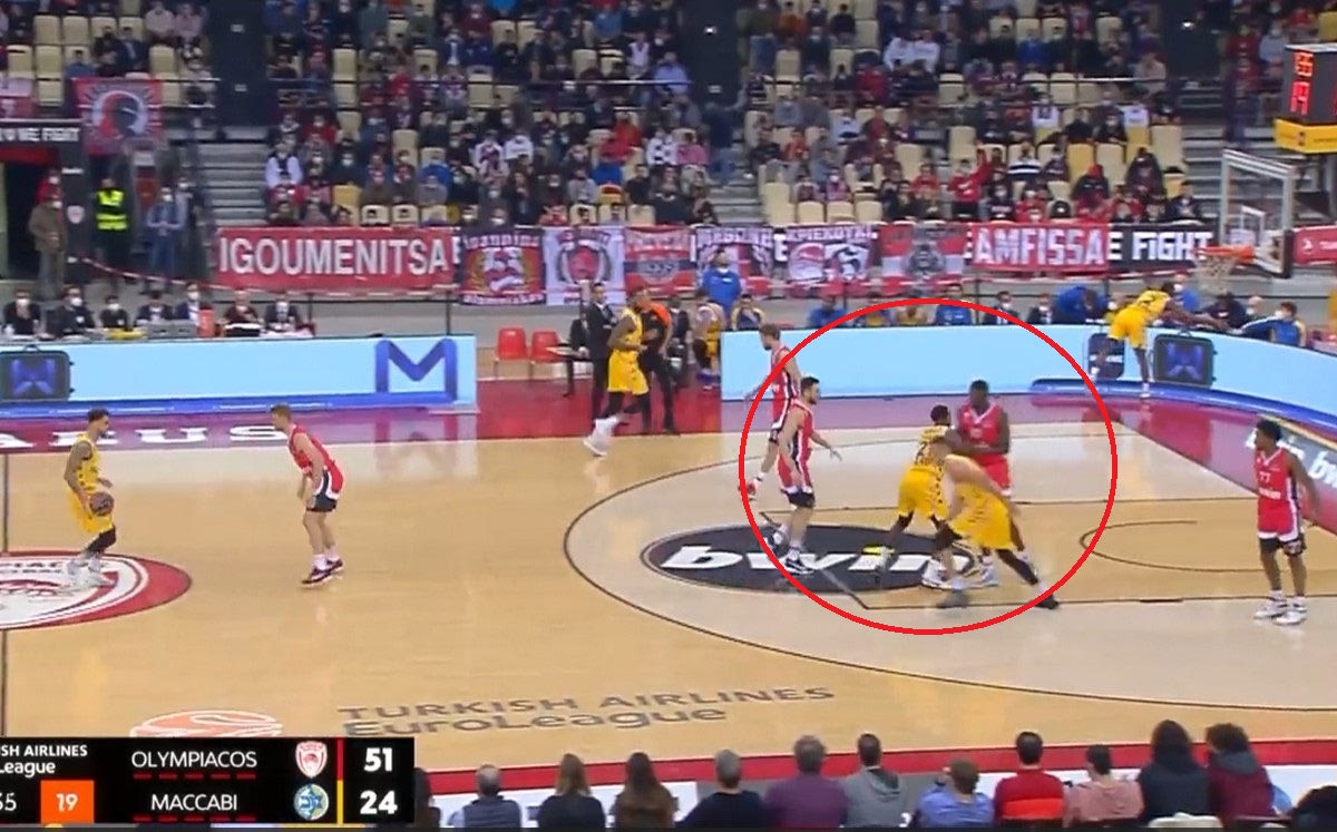 Ο Ολυμπιακός πίεσε την Μακάμπι στα 3/4 του γηπέδου, ενώ για πρώτη φορά άλλαξε σε έναν βαθμό την άμυνά του στο Πικ εν Ρολ. Οι “ερυθρόλευκοι” φέτος μέχρι στιγμής έχουν αμυνθεί με τρεις τρόπους σε τέτοιου είδους επίθεση: Flat όταν εμπλέκεται ο Φαλ ή ο Μάρτιν (όπου μένουν πίσω), δυναμικό hedge out (όταν εμπλέκεται ο Βεζένκοφ) και αλλαγές σε όλα τα σκριν (κάτι που γίνεται έτσι κι αλλιώς από τις θέσεις 1 έως 4, αλλά ισχύει και για τα πεντάρια στα κρίσιμα σημεία). Κόντρα στην Μακάμπι ωστόσο επέλεξαν κάτι διαφορετικό στις τρεις πρώτες περιόδου, παίζοντας συχνά “ICE” στα σκριν στις 45 μοίρες όταν ο ψηλός που αμυνόταν ήταν ο Φαλ. Έβαζαν δηλαδή τον γκαρντ που μάρκαρε την μπάλα να “αρνείται” το σκριν στον χειριστή της μπάλας και τον έστελναν στην πλάγια γραμμή.