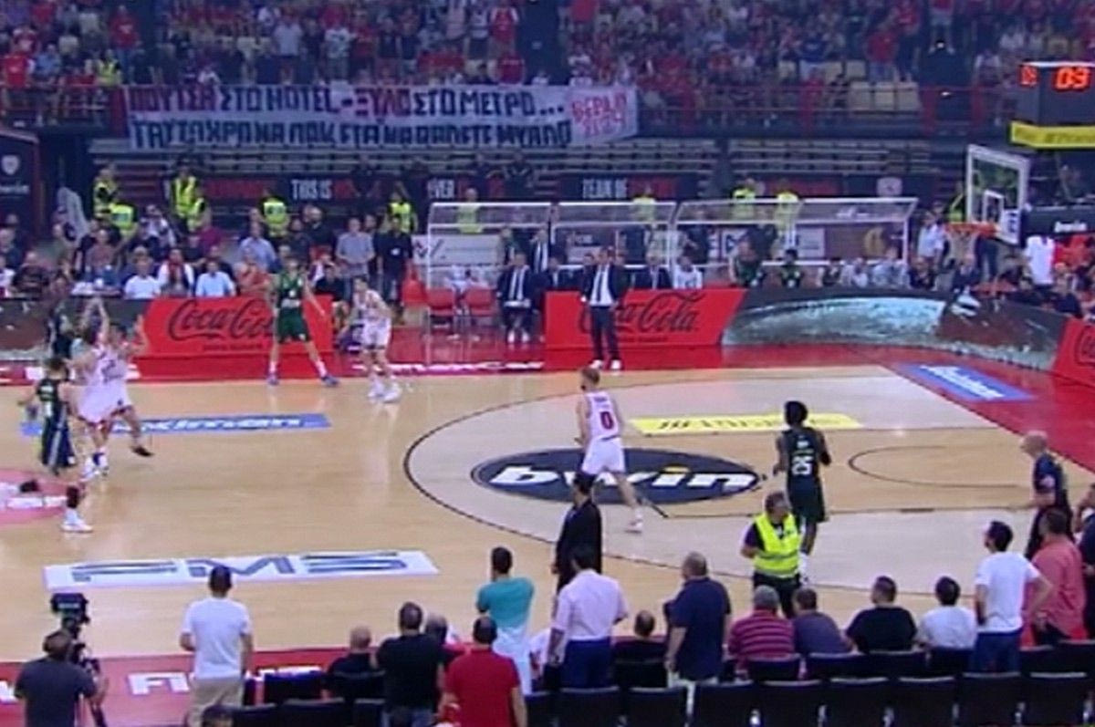 Απίθανο buzzer beater από τον Τζέριαν Γκραντ στο φινάλε του πρώτου μέρους του τελικού ανάμεσα στον Ολυμπιακό και τον Παναθηναϊκό AKTOR, με τον παίκτη των πρασίνων να ευστοχεί λίγο πιο μπροστά από το κέντρο.