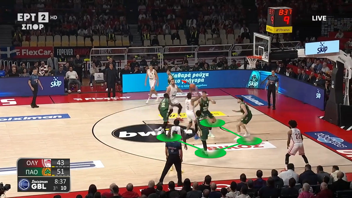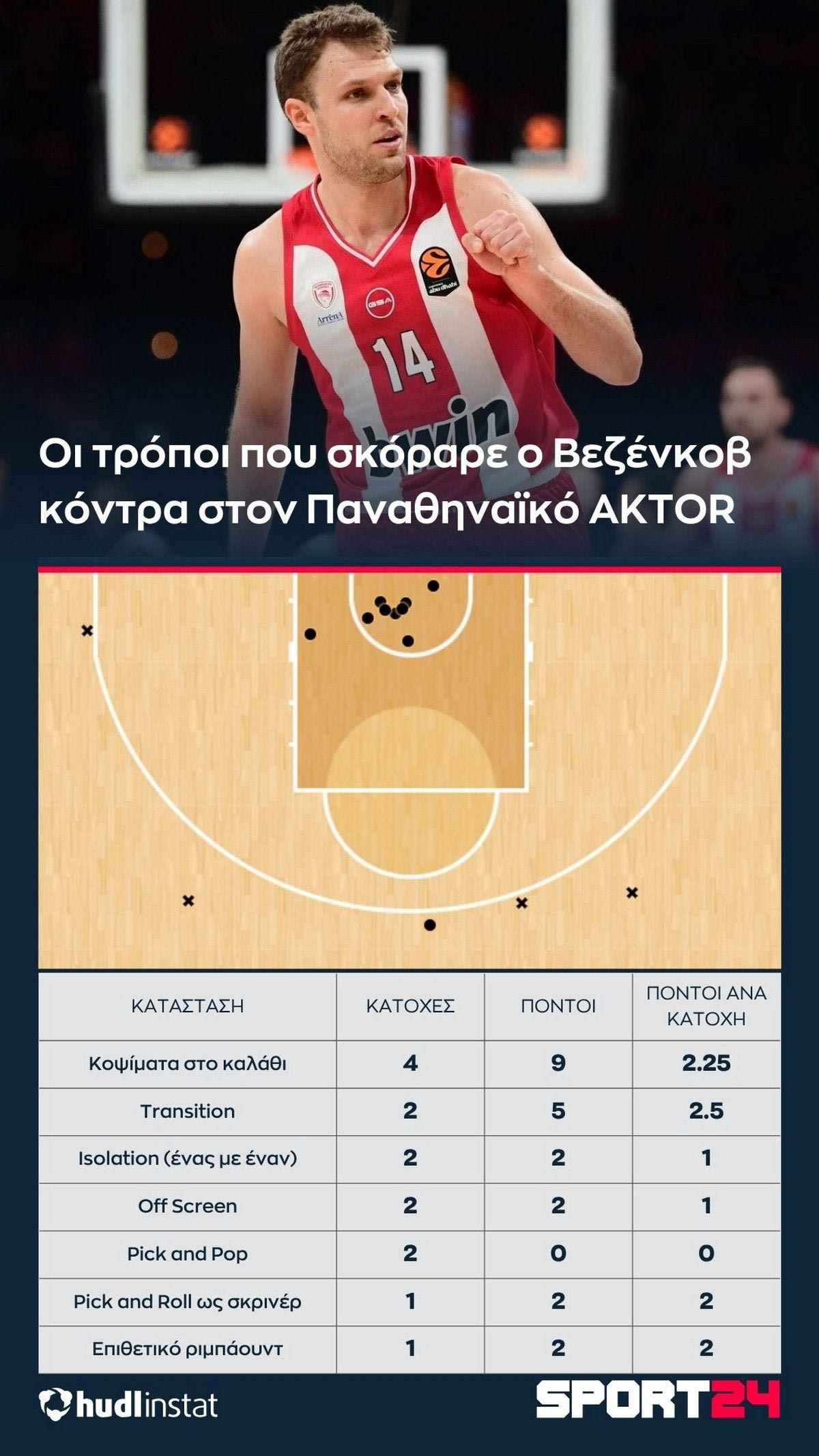 Ο σταρ του Ολυμπιακού χτύπησε με πολλούς τρόπους τους “πράσινους”. Σε μία βραδιά που δεν έμπαιναν τα σουτ, ο Βεζένκοβ χτύπησε με το βασικό του όπλο (κίνηση μακριά από την μπάλα).