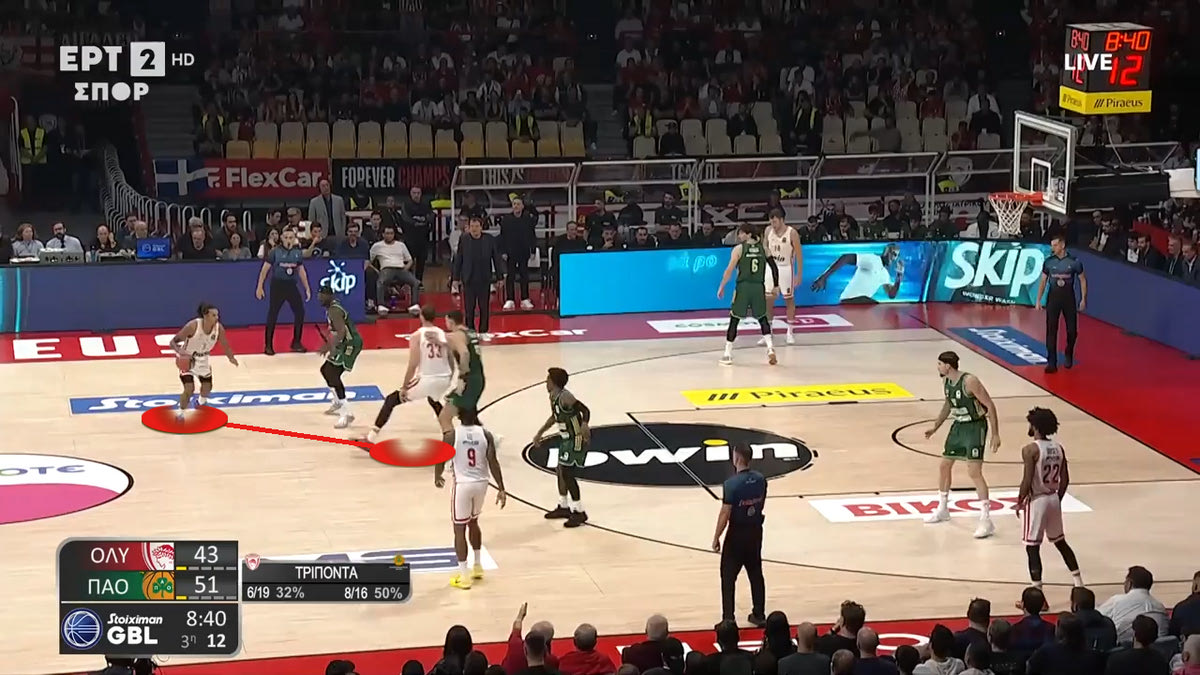 Ο Σέρβος ψηλός δεν είχε παίκτη στα μέτρα του, κάτι που τον βοήθησε να κυριαρχήσει. Κι αν σε πρώτο βαθμό η φράση “να κυριαρχήσει” ακούγεται ακραία, αρκούν δύο αριθμοί για να το καταλάβει κάποιος αυτό: Σύμφωνα με το Hudl Instat, ο Ολυμπιακός σημείωνε 1.1 πόντους ανά κατοχή με τον Σέρβο στο παρκέ και δεχόταν μόλις 0.82 ανά κατοχή. Αυτή η διαφορά 0.28 πόντων ανά κατοχή σε παίκτη που αγωνίστηκε 23 λεπτά (22 λεπτά και 34 δευτερόλεπτα για την ακρίβεια) είναι τεράστια. Ο Ολυμπιακός ήταν άλλη ομάδα με τον Μιλουτίνοβ στο παρκέ, αφού ο Παναθηναϊκός AKTOR έπρεπε να ασχοληθεί μαζί του, με αποτέλεσμα να ανοίξουν οι χώροι.