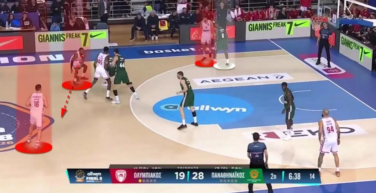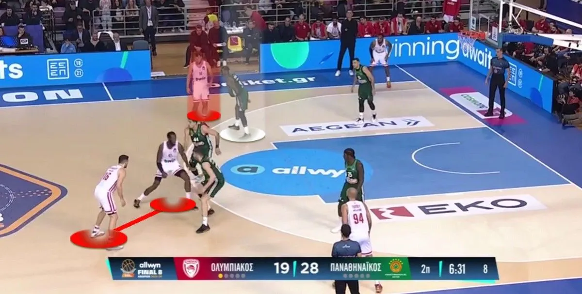 Ο Ολυμπιακός είχε πρόβλημα κόντρα σε αυτή την άμυνα, το οποίο γιγαντώθηκε λόγω της ανετοιμότητας του Τάιλερ Ντόρσεϊ, ο οποίος ενσωματώθηκε τελευταία στιγμή στην ομάδα μετά το ταξίδι αστραπή στις ΗΠΑ, για προσωπικούς λόγους. Οι Πειραιώτες δεν είχαν τρίτο πόλο εκτέλεσης (μετά τους Βεζένκοβ, Φουρνιέ), δεν είχαν το απροσδόκητο, την προσωπική φάση που ίσως υποχρέωνε την άμυνα του Παναθηναϊκού AKTOR να προσαρμοστεί αντίστοιχα.